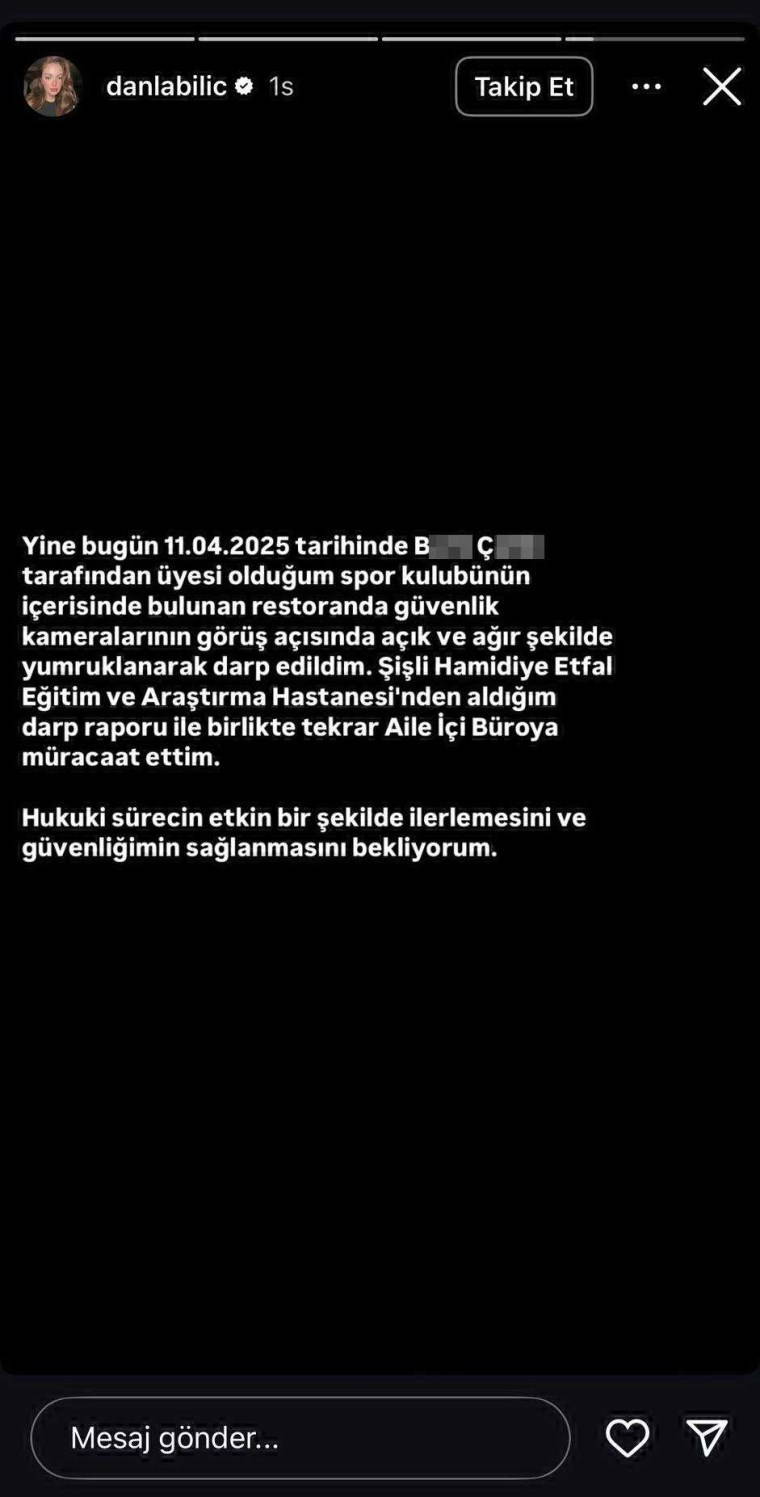 Yine bugün 11.04.2025 tarihinde B. Ç. tarafından üyesi olduğum spor kulübünün içerisinde bulunan restoranda güvenlik kameralarının görüş açısında açık ve ağır şekilde yumruklanarak darp edildim. Şişli Hamidiye Etfal Eğitim ve Araştırma Hastanesi'nden aldığım darp raporu ile birlikte tekrar Aile İçi Büroya müracaat ettim. Hukuki sürecin etkin bir şekilde ilerlemesini ve güvenliğimin sağlanmasını bekliyorum" ifadelerini kullandı.