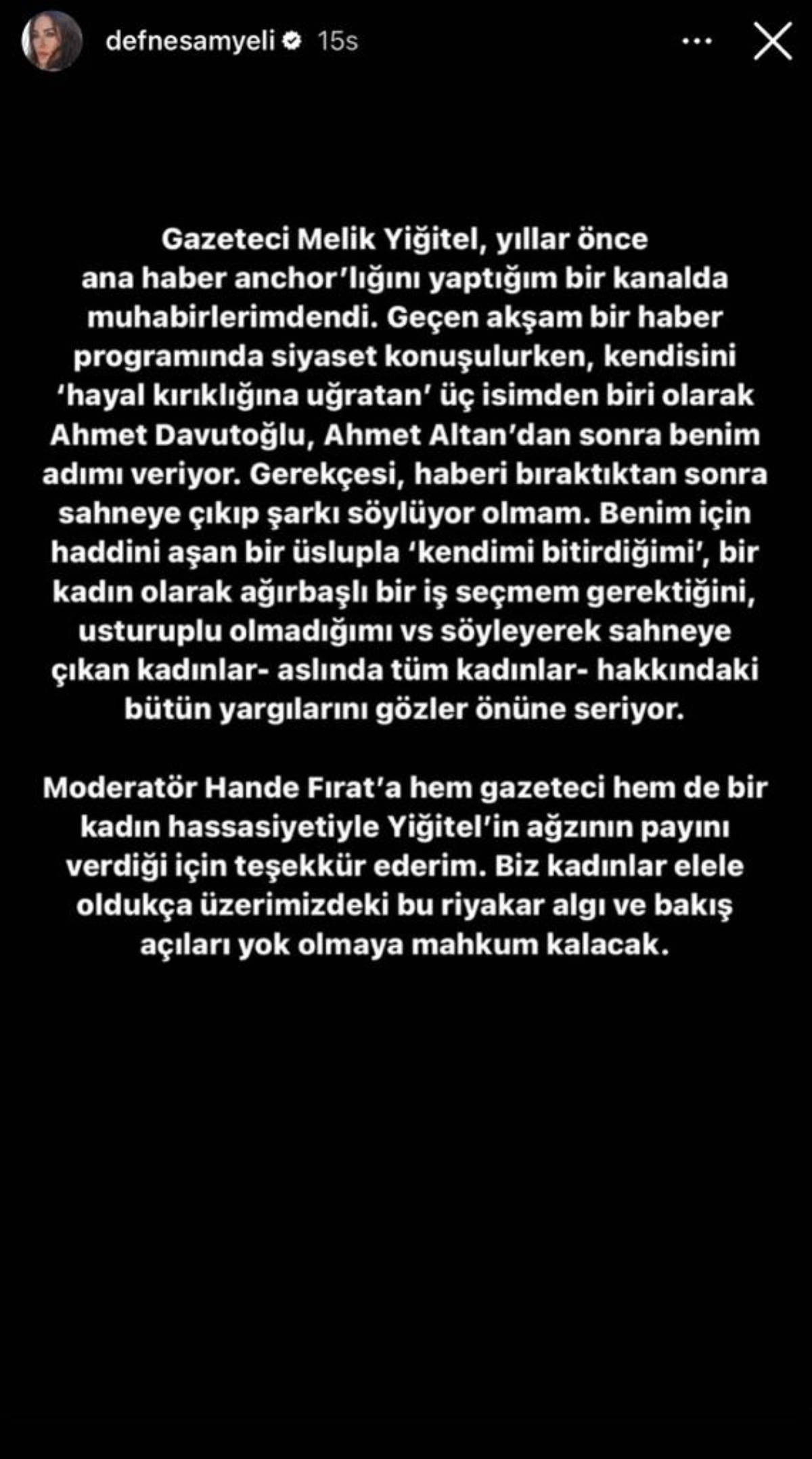 Gerekçesi haberi bıraktıktan sonra sahneye çıkıp şarkı söylüyor olmam… Benim için haddini aşan bir üslupla kendimi bitirdiğimi, bir kadın olarak ağırbaşlı ve is seçmem gerektiğini usturuplu olmadığımı vs. söyleyerek sahneye çıkan kadınlar, aslında tüm kadınlar hakkındaki bütün yargılarını gözler önüne seriyor. Moderatör Hande Fırat’a hem gazeteci hem de bir kadın hassasiyetiyle Yiğitel’in ağzının payını verdiği için teşekkür ederim. Biz kadınlar el ele oldukça üzerimizdeki bu riyakar algı ve bakış açıları yok olmaya mahkum kalacak…