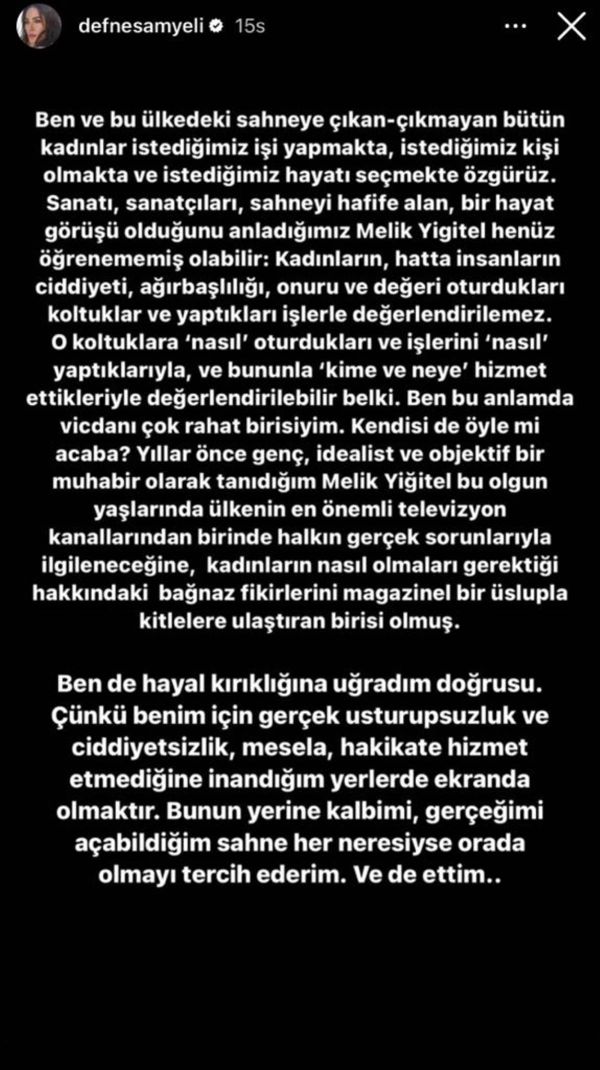 Ben ve bu ülkedeki sahneye çıkan çıkmayan bütün kadınlar istediğimiz işi yapmakta istediğimiz kişi olmakta ve istediğimiz hayatı seçmekte özgürüz. Sanatı, sanatçıları, sahneyi hafife alan bir hayat görüşü olduğunu anladığımız Melik Yiğitel henüz öğrenememiş olabilir kadınların hatta insanların ciddiyeti, ağırbaşlılığı, onuru ve değeri oturdukları koltuklar ve yaptıkları işlerle değerlendirilemez. O koltuklara nasıl oturdukları ve işleri nasıl yaptıklarıyla ve bununla kime ve neye hizmet ettikleriyle değerlendirilebilir belki… Ben bu anlamda vicdanına çok rahat birisiyim. Kendisi de öyle mi acaba?