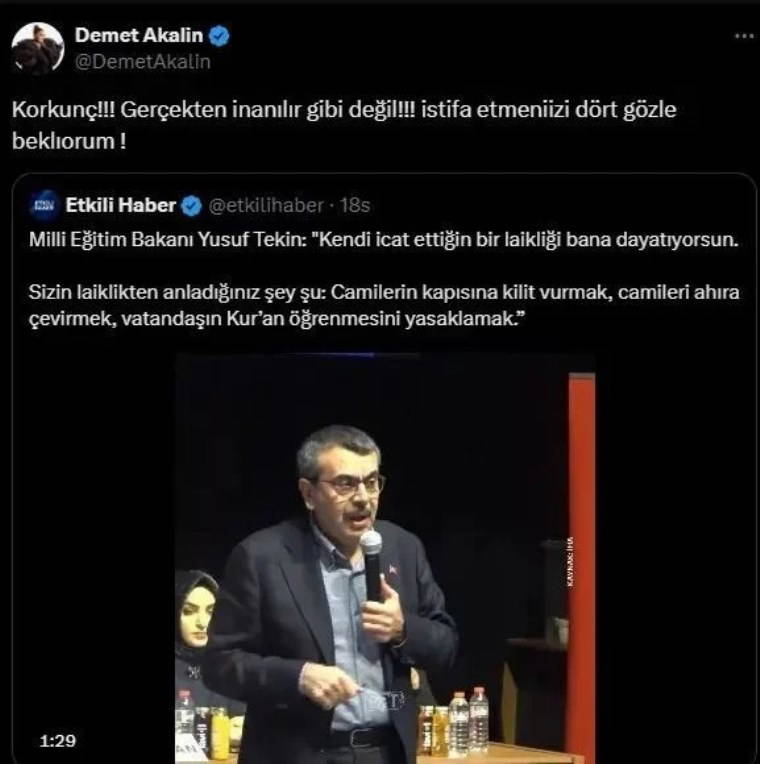 Ünlü şarkıcı Demet Akalın, laikliği hedef alan açıklamalarda bulunan Milli Eğitim Bakanı Yusuf Tekin'e yönelik istifa çağrısı yaptığı paylaşımını sildi.