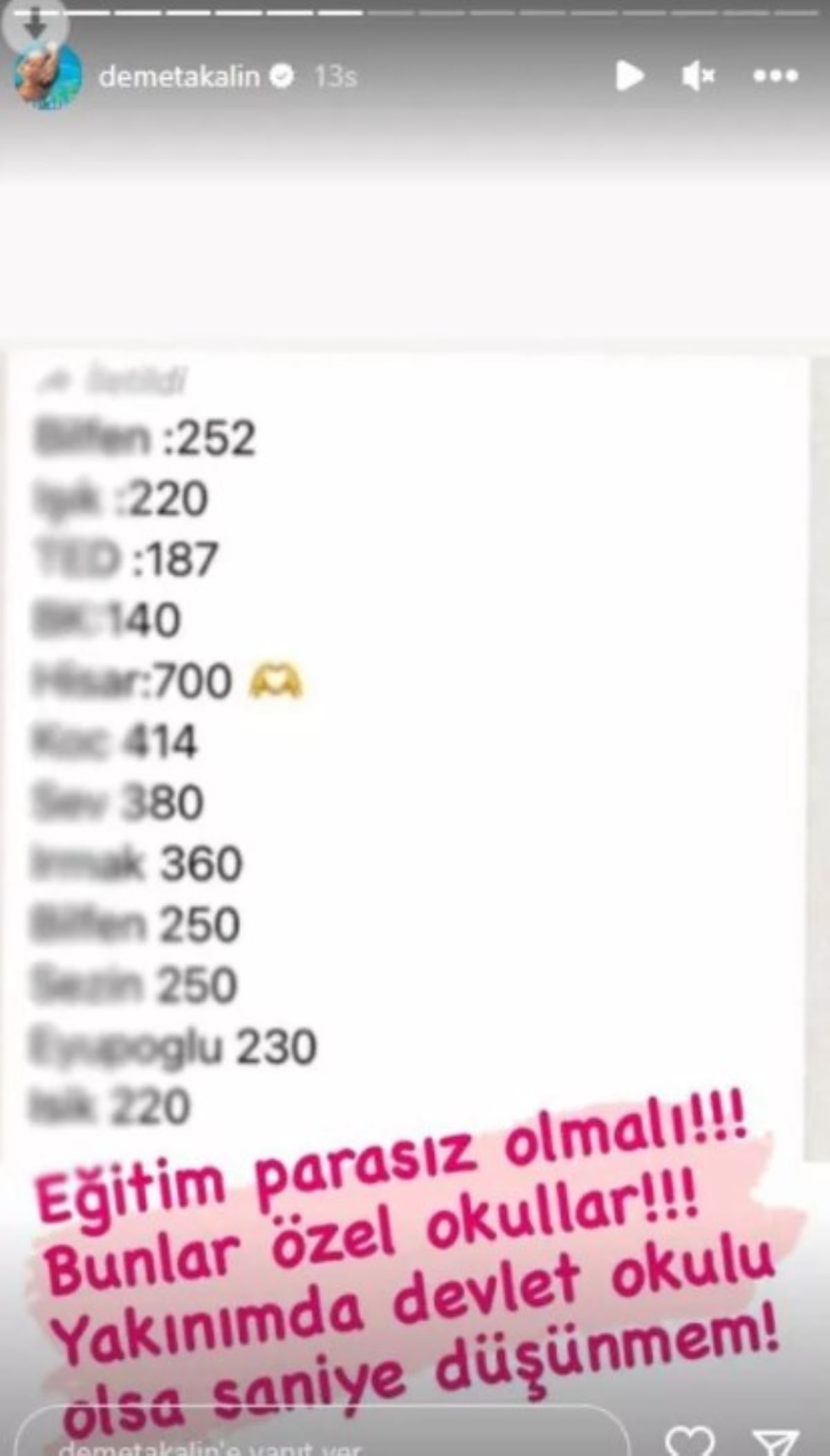 Instagram hesabından bazı okulların fiyat listesi olduğu iddia edilen bir fotoğrafı paylaşan Akalın, "Eğitim parasız olmalı. Bunlar özel okullar. Yakınımda devlet okulu olsa saniye düşünmem" dedi.