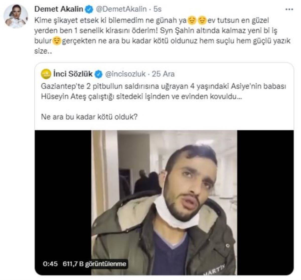 Yaşanan duruma sosyal medyada tepkiler yükselirken; şarkıcı Demet Akalın da hızla yayılan habere sessiz kalamadı. Yardım çağrısında bulunan Akalın, "Kime şikayet etsek ki bilemedim ne günah ya. Ev tutsun en güzel yerden ben 1 senelik kirasını öderim! Sayın Şahin altında kalmaz yeni bir iş bulur. Gerçekten ne ara bu kadar kötü oldunuz hem suçlu hem güçlü yazık size" ifadelerini kullandı.