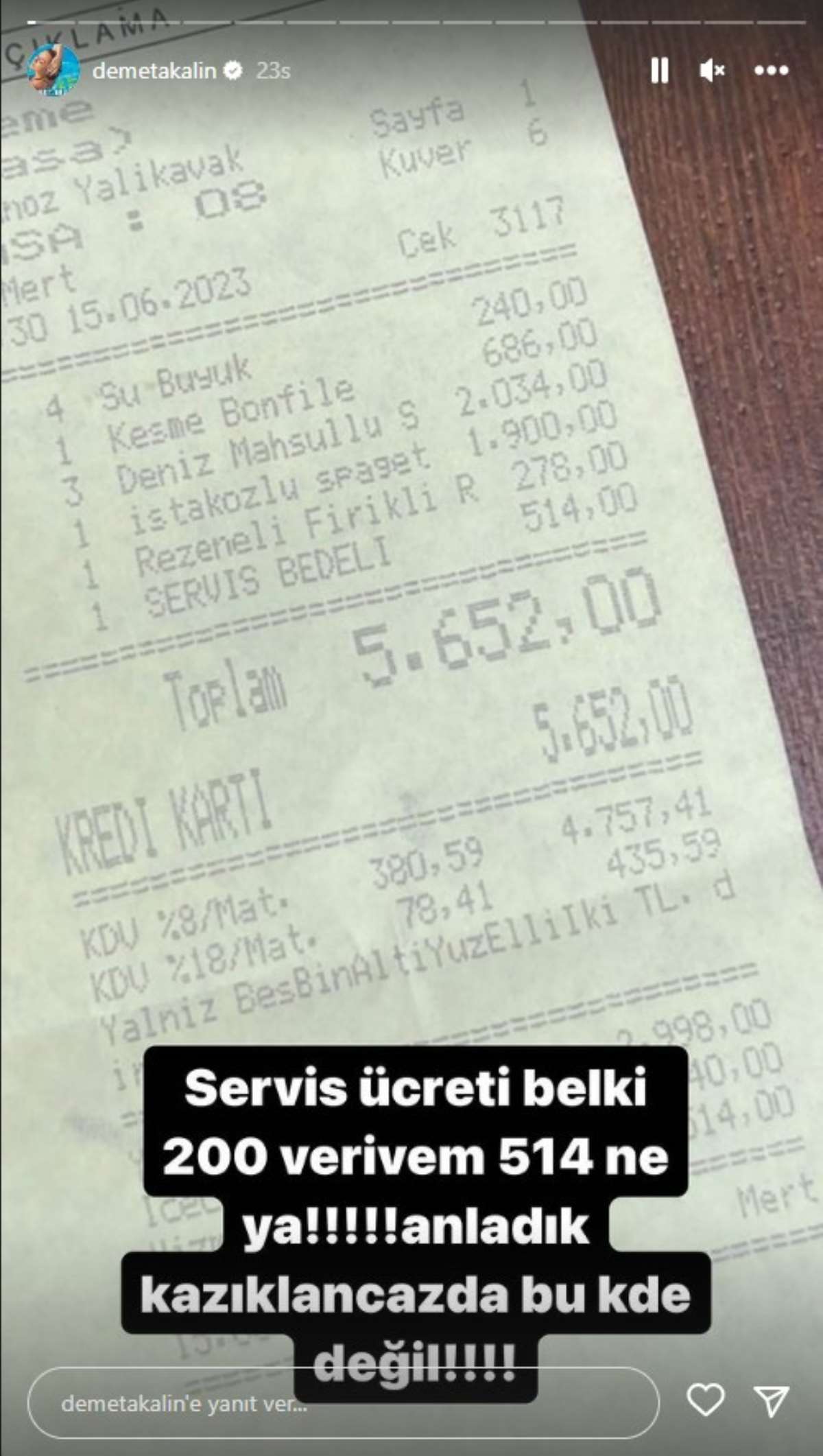 Yemek yediği yerde 5 bin 652 liralık hesabın 514 lirasının servis ücreti olduğunu gören Demet Akalın da tepki gösterdi.