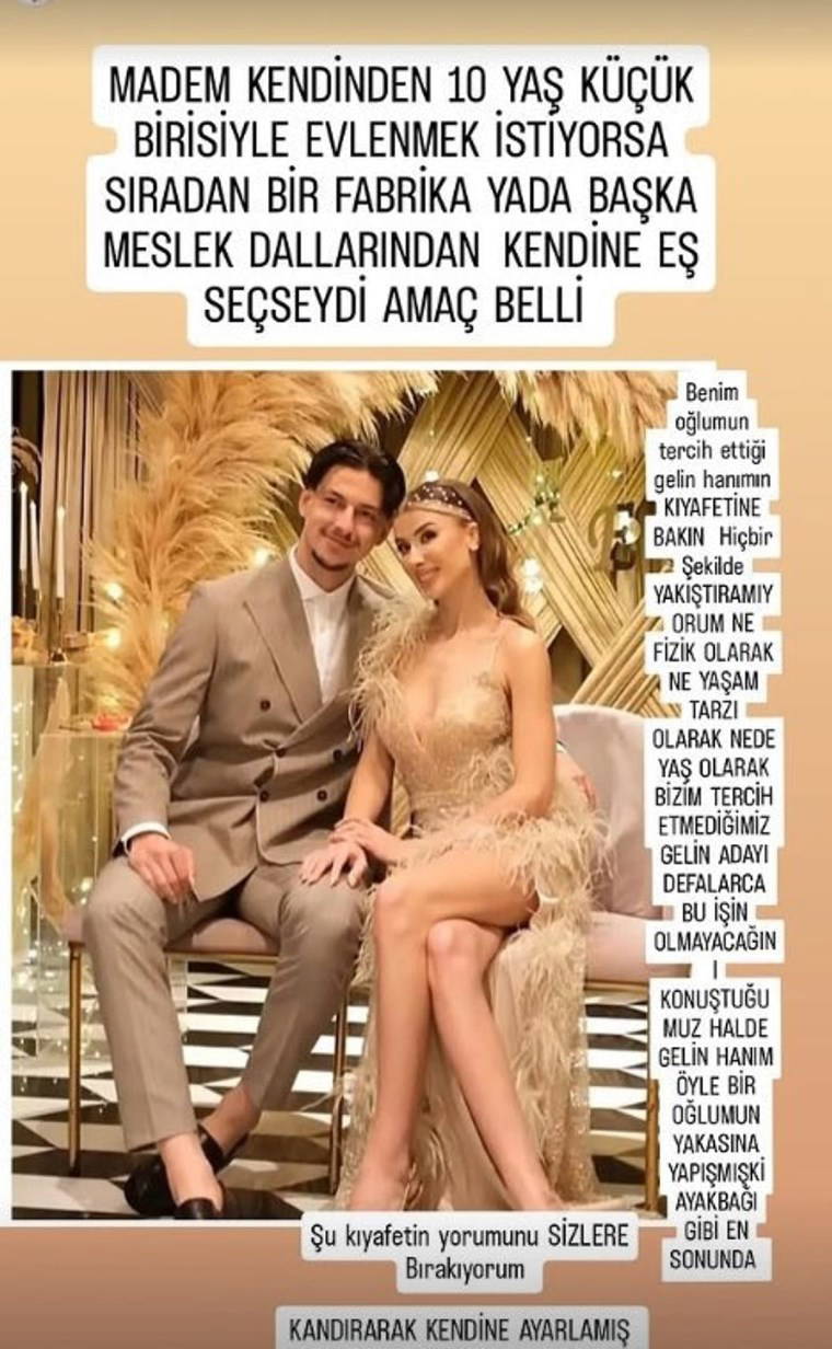 "Madem kendinden 10 yaş küçük birisiyle evlenmek istiyorsa sıradan bir fabrika ya da başka meslek dallarından kendine eş seçseydi, amaç belli. Benim oğlumun tercih ettiği gelin hanımın kıyafetine bakın. Hiçbir şekilde yakıştırmıyorum. Ne fizik olarak, ne yaşam tarzı olarak ne de yaş olarak bizim tercih etmediğimiz gelin adayı. Defalarca bu işin olmayacağını konuştuğumuz halde gelin hanım öyle bir oğlumun yakasına yapışmış ki, ayak bağı gibi en sonunda. Şu kıyafetin yorumunu sizlere bırakıyorum."