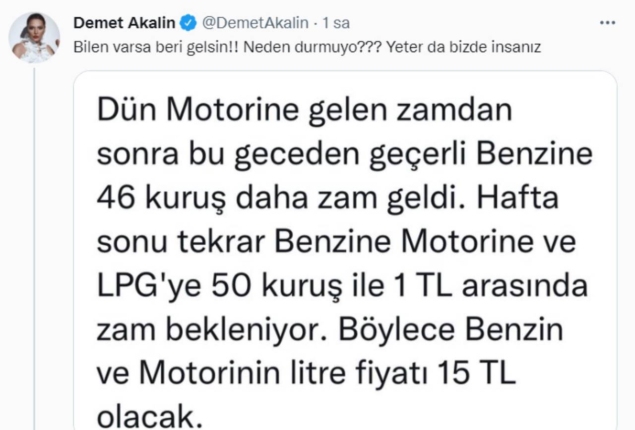 Ünlü şarkıcı Demet Akalın sosyal medya hesabından benzin ve motorine gelen zamlara isyan etti.