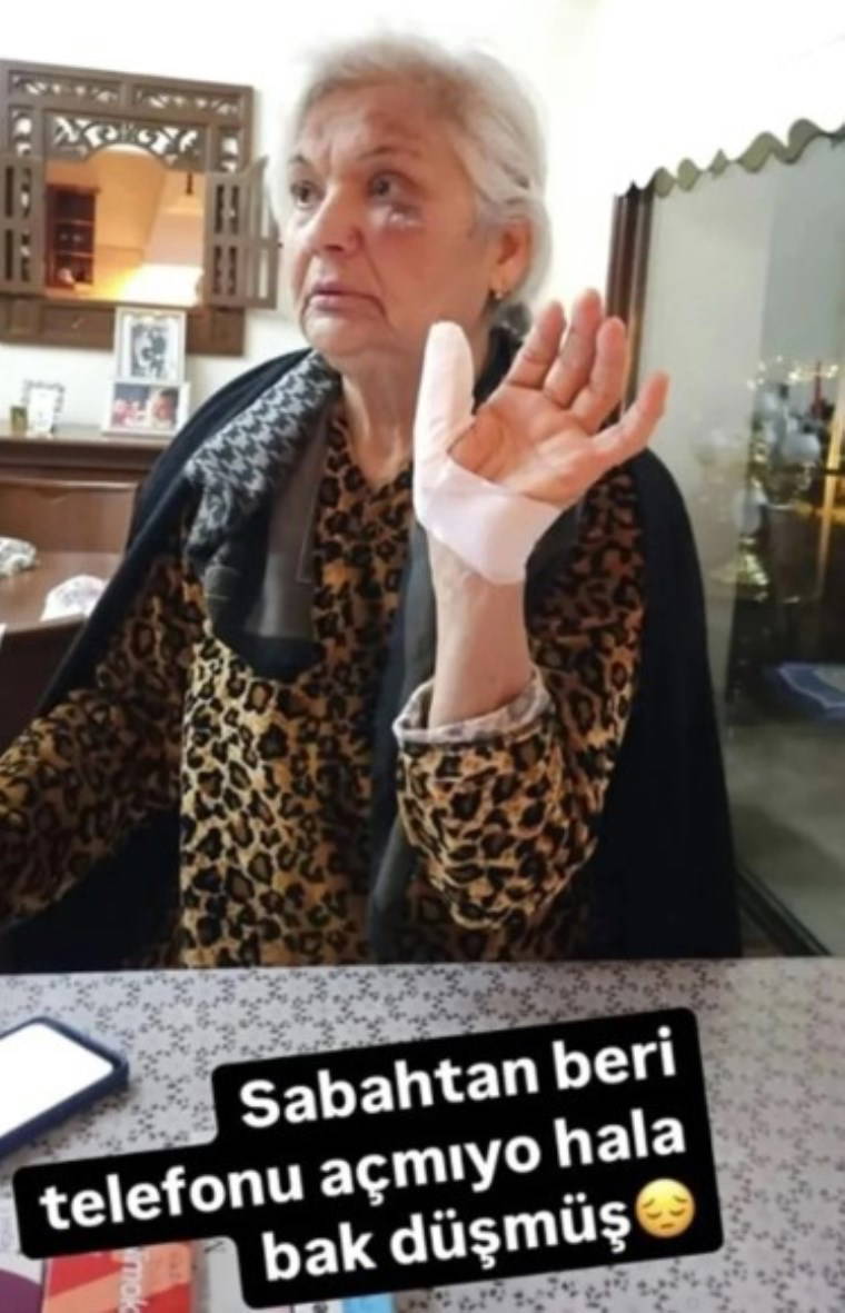 Parmağını inciten ve gözü şişen annesinin fotoğrafını paylaşan Akalın, "Sabahtan beri telefonunu açmıyor hala, bak düşmüş" ifadelerini kullandı.