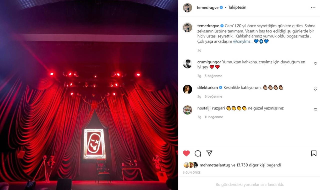 “Cem’i 20 yıl önce seyrettiğim günlere gittim. Sahne zekasının üstüne tanımam. Vasatın baş tacı edildiği şu günlerde bir hiciv ustası seyrettik. Kahkahalarımız yumruk oldu boğazımızda . Çok yaşa arkadaşım.”