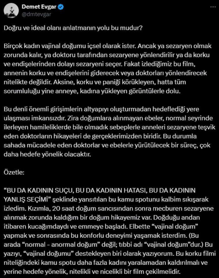 “Bu da kadının suçu” şeklinde yansıtılan kamu spotunu izlerken zorlandığını ifade eden Evgar, kadınların üzerinde baskı yaratan bu tarz içeriklerin kaldırılmasını istedi. “Vajinal doğum” yapmayı destekleyen biri olduğunu belirten oyuncu, kamu spotunun daha hedefe yönelik ve nitelikli bir şekilde hazırlanması gerektiğini söyledi.
