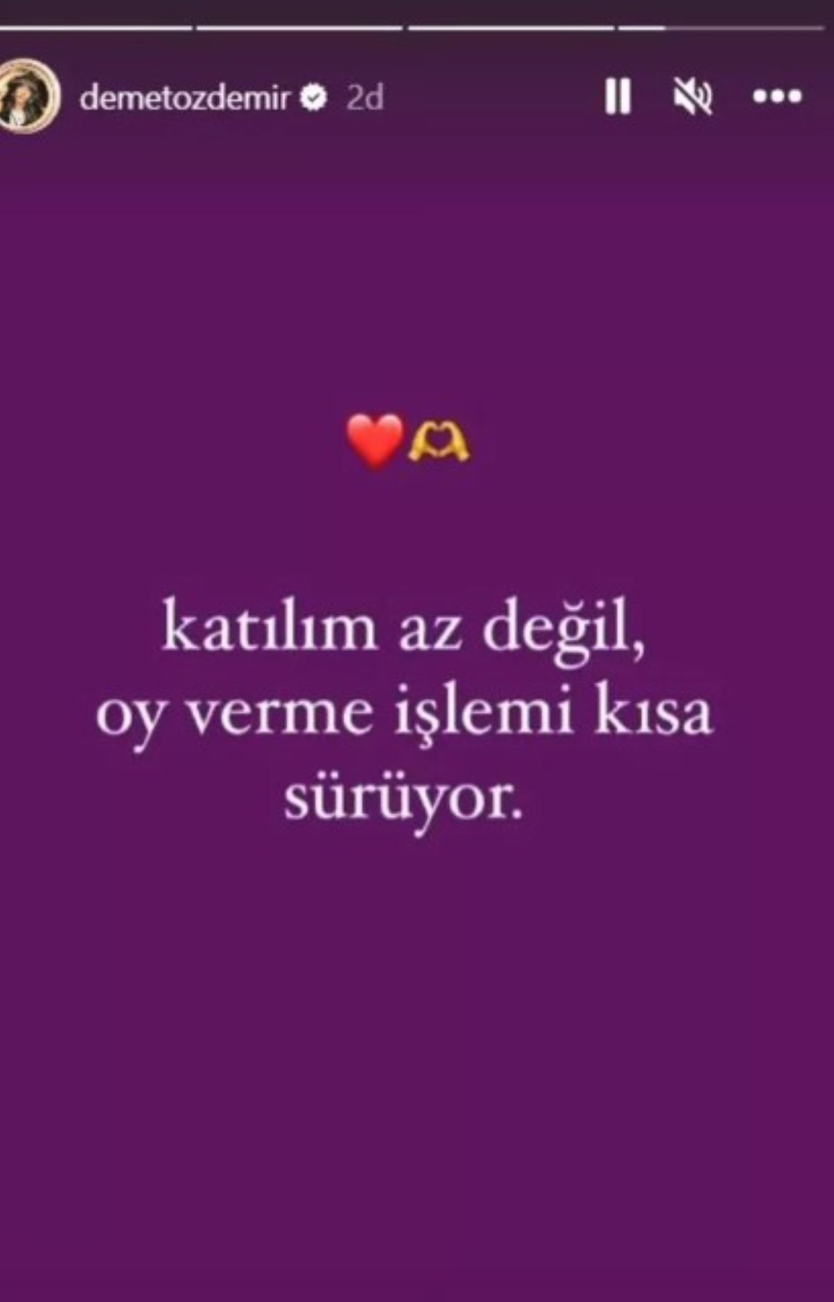 Ünlü oyuncu Demet Özdemir de sosyal medya hesabından seçime katılımın az olduğu iddialarına ilişkin yorumda bulundu.