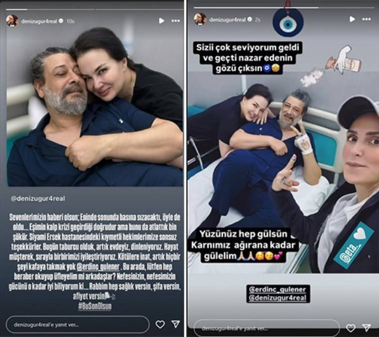 "Sevenlerimizin haberi olsun, eninde sonunda basına sızacaktı, öyle de oldu… Eşimin kalp krizi geçirdiği doğrudur ama bunu da atlattık, bin şükür. Kıymetli hekimlerimize sonsuz teşekkürler. Bugün taburcu olduk, artık evdeyiz, dinleniyoruz. Hayat müşterek, sırayla birbirimizi iyileştiriyoruz. Kötülere inat, artık hiçbir şeyi kafaya takmak yok Erdinç Gülener."