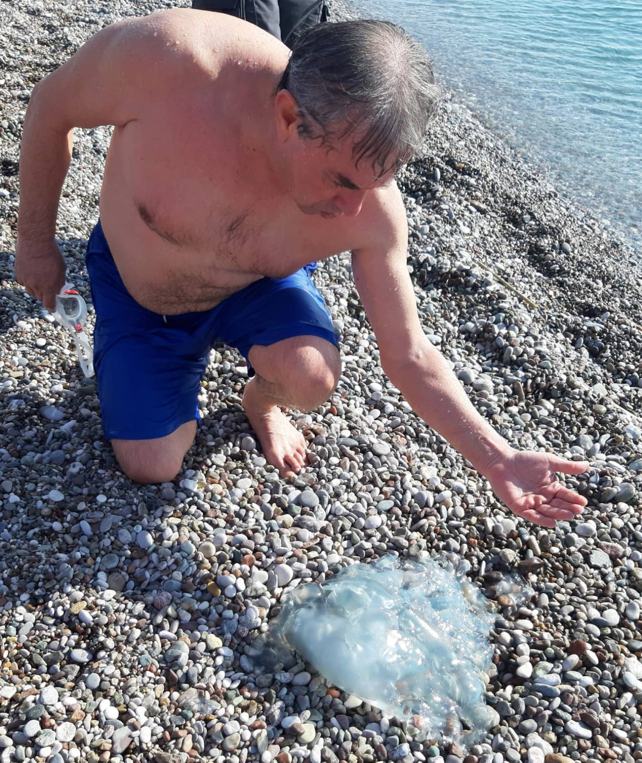 Antalya Konyaaltı Sahili'nde arkadaş grubuyla yaz- kış denize giren Akdeniz Üniversitesi Ziraat Fakültesi Öğretim Üyesi Prof. Dr. Burhan Özkan'ı, kıyıya yakın bir bölgede denizanası çarptı. Arkadaşlarının da bir denizanasını çubukla karaya çıkarttığı anlar, cep telefonu kamerasına yansıdı.