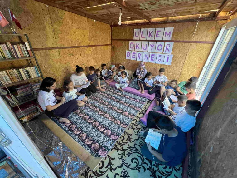 "Havva hanım o süreçte bize kitap getirdi, o kitap getirince çocuklarla beraber ben de okumaya başladım. Depremden sonra evimiz yıkıldı böyle bir kulübe kurduk, buraya minderler attık, önce çocuklarıma örnek olmak için ben okudum sonra çocuklarım okudu, daha sonra da mahallemizin kızları, çocukları buraya gelmeye ve kitap okumaya başladı. Ülkem Okuyor Derneği de sağ olsun bize kitap desteği veriyor. Çocuklar öğleden sonra okul çıkışı geliyor onlarla önce kitap okuma etkinliği yapıyoruz sonra sırayla çocuklara okudukları kitapları anlattırıyorum, ben de çocuklar da çok memnun oluyoruz."
