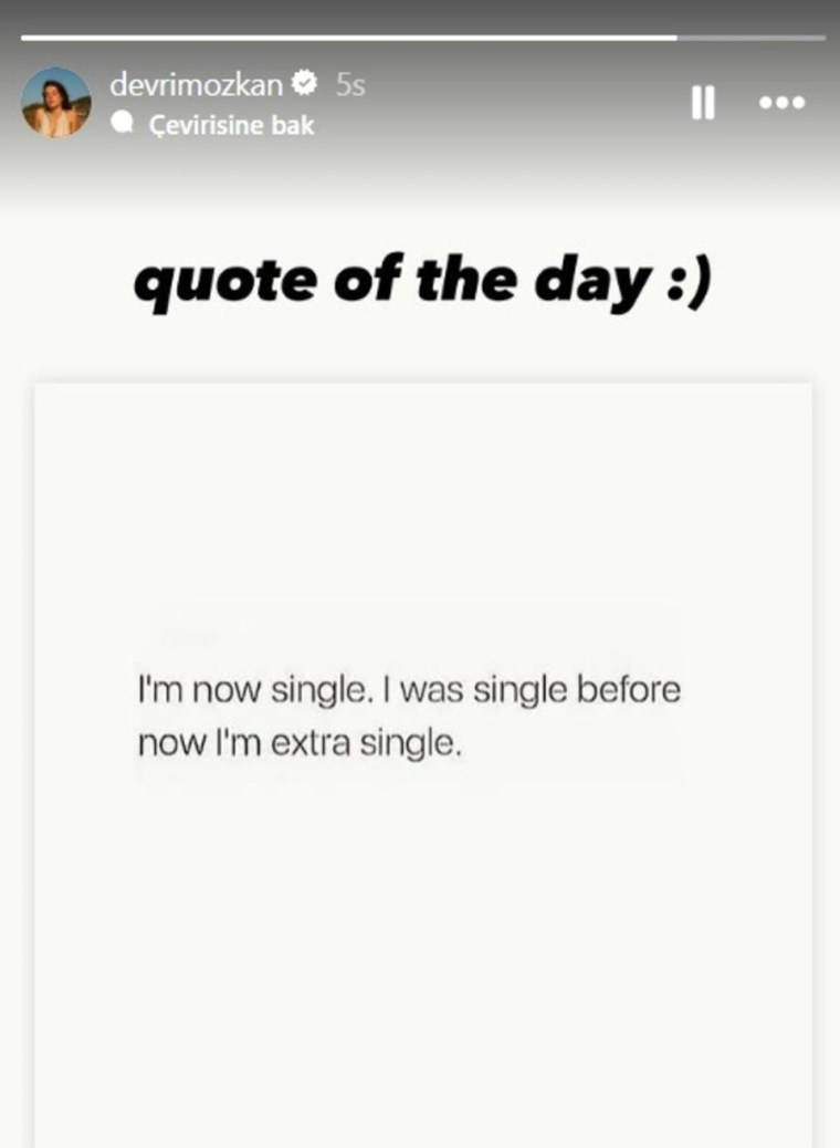 Çıkan aşk iddialarına sessiz kalmayan Devrim Özkan, sosyal medya hesabından bir paylaşım yaparak bu konudaki suskunluğunu bozdu. "Günün alıntısı" notuyla paylaştığı gönderisinde, "Bekarım. Daha önce bekardım, şimdi ekstra bekarım" ifadelerine yer verdi. Özkan’ın bu paylaşımı, aşk iddialarını yalanladığı şeklinde yorumlandı.