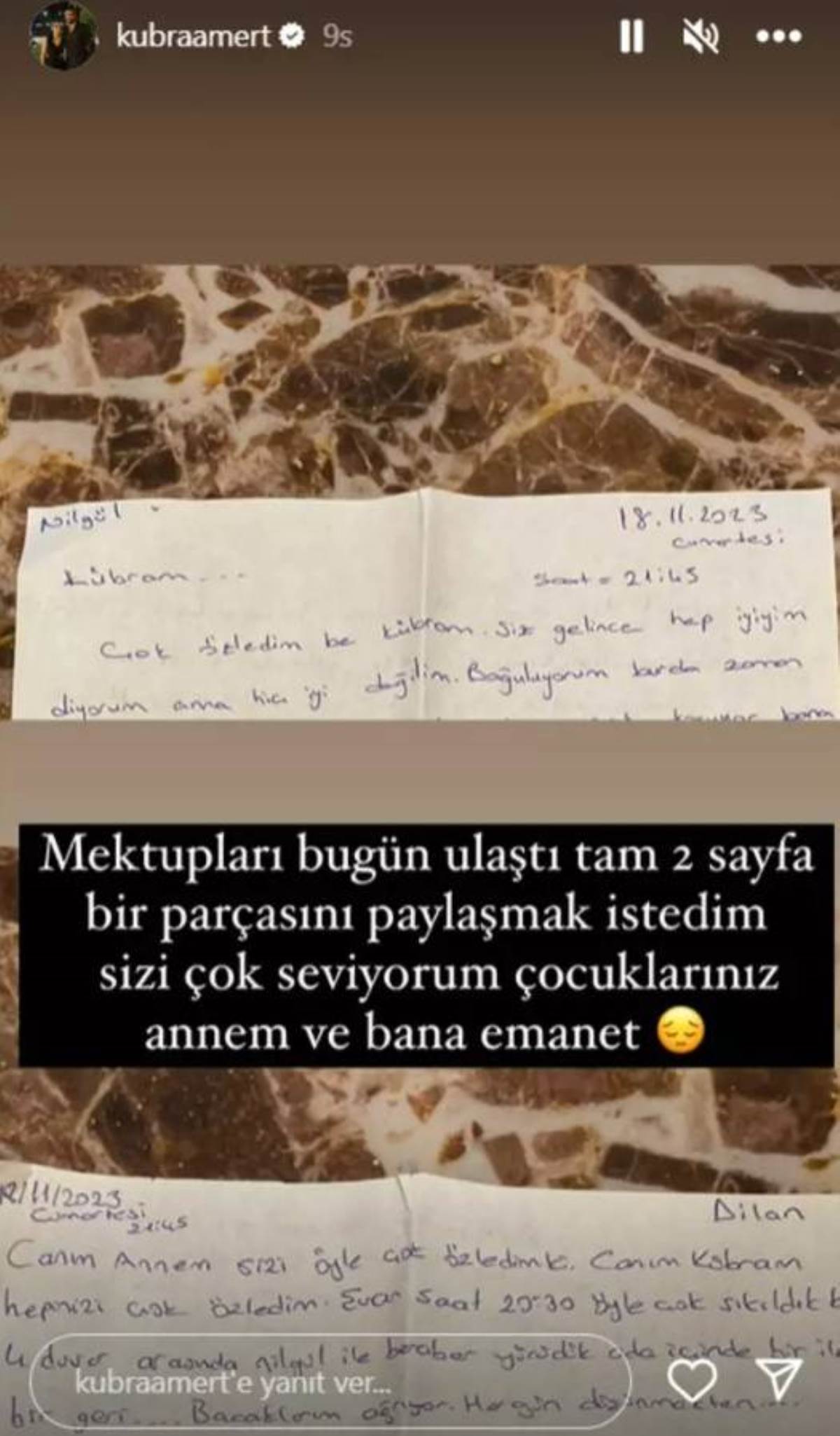 "Çok özledim be Kübra'm. Size gelince hep iyiyim diyorum ama hiç iyi değilim. Boğuluyorum burada. Canım annem sizi öyle çok özledim ki. Canım Kübra'm hepinizi çok seviyorum. Şuan saat 20:30 öyle sıkıldık ki dört duvar arasında Nilgün ile beraber yürüdük oda içerisinde bir ileri bir geri... Bacaklarım ağrıyor. Her gün düşünmekten..."