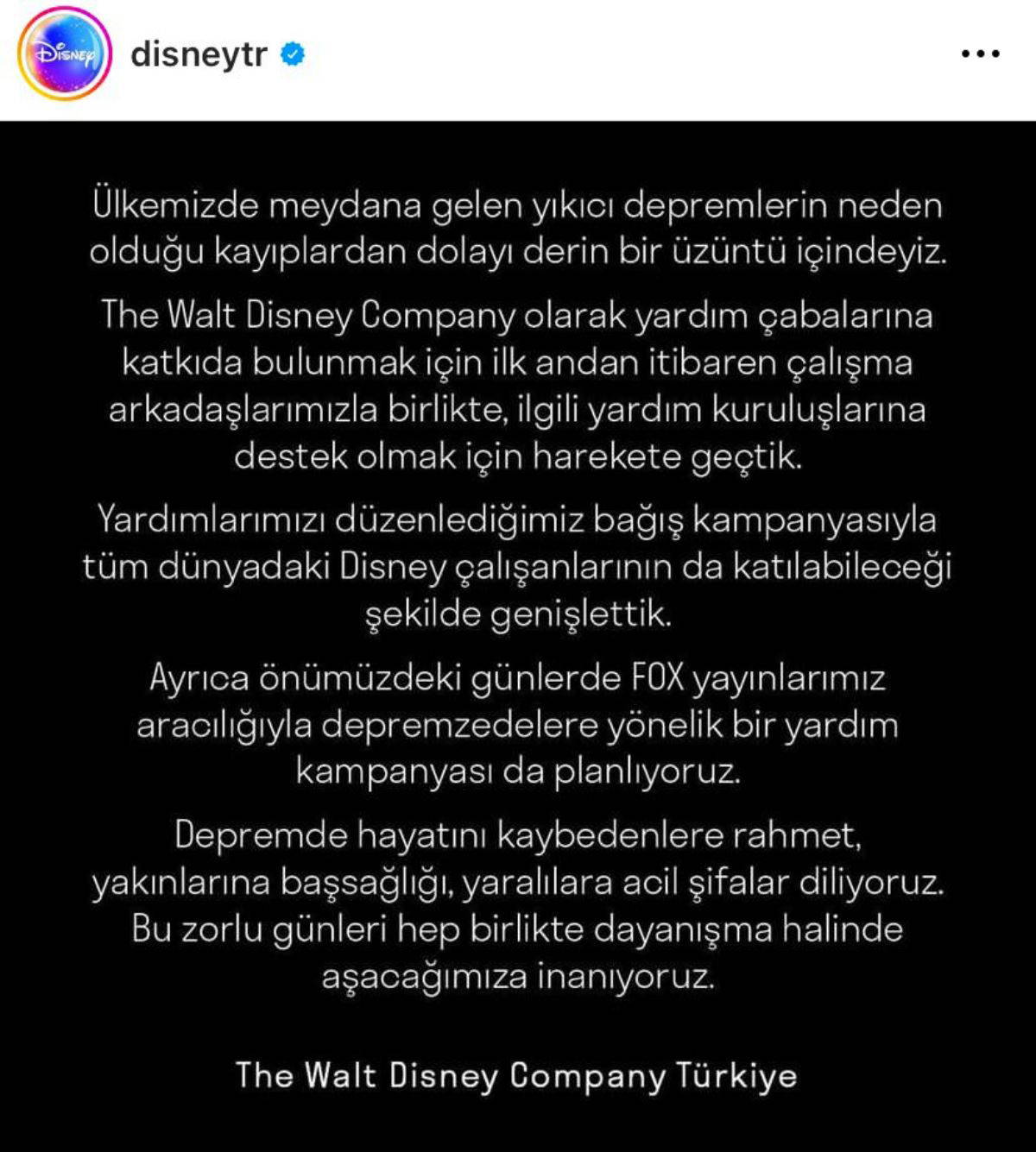 "Ülkemizde meydana gelen yıkıcı depremlerin neden olduğu kayıplardan dolayı derin bir üzüntü içindeyiz. The Walt Disney Company olarak yardım çabalarına katkıda bulunmak için ilk andan itibaren çalışma arkadaşlarımızla birlikte, ilgili yardım kuruluşlarına destek olmak için harekete geçtik.