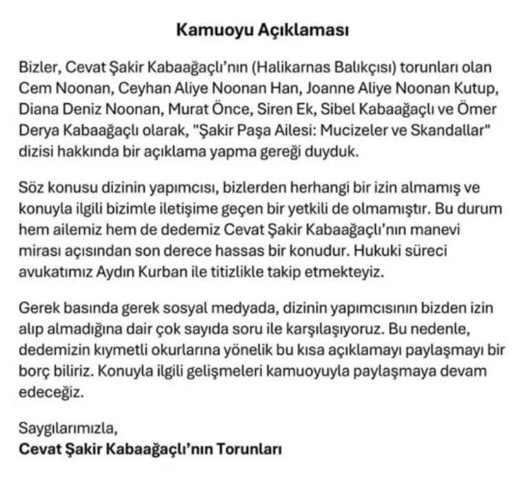 "Bizler, Cevat Şakir Kabaağaçlı’nın (Halikarnas Balıkçısı) torunları olan Cem Noonan, Ceyhan Aliye Noonan Han, Joanne Aliye Noonan Kutup, Diana Deniz Noonan, Murat Önce, Siren Ek, Sibel Kabaağaçlı ve Ömer Derya Kabaağaçlı olarak, 'Şakir Paşa Ailesi: Mucizeler ve Skandallar' dizisi hakkında bir açıklama yapma gereği duyduk.