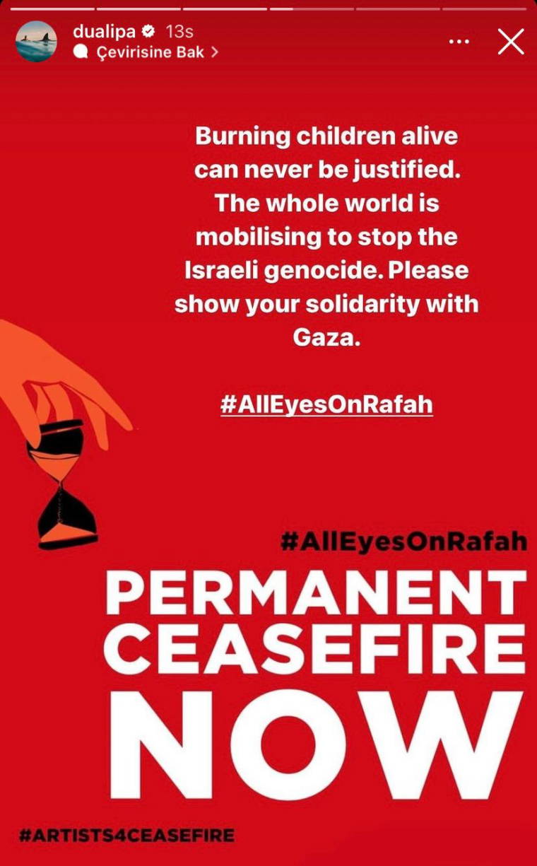 Hikaye bölümünden "#AllEyesonRafah (Tüm gözler Refah'ın üstünde)" etiketiyle yaptığı paylaşımda Lipa, "Çocukların diri diri yakılmasına asla haklı bir sebep gösterilemez. Tüm dünya, İsrail soykırımını durdurmak için seferber oluyor" ifadelerine yer verdi.