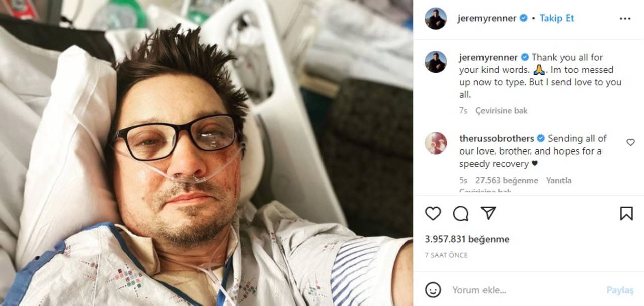 Fotoğrafı kendi çektiği gözlenen Renner sağlık durumuyla ilgili olarak "İyi dilekleriniz için hepinize teşekkür ederim. Şimdi yazamayacak kadar berbatım. Ama hepinize sevgilerimi gönderiyorum" ifadelerini kullandı.