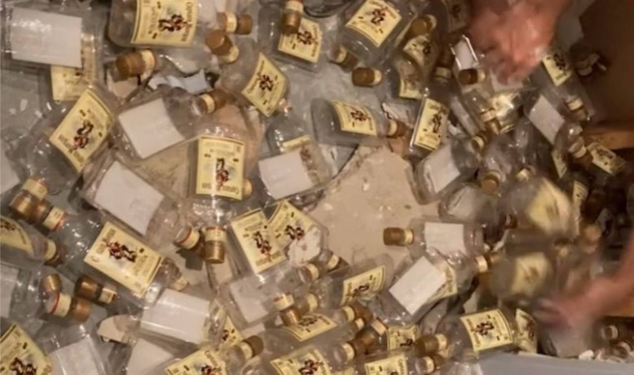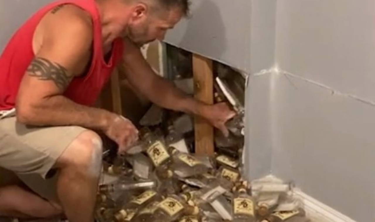 LADbible'ın haberine göre çift, alçı levhayı sökmesiyle yüzlerce içki şişesiyle karşılaştı. İçi tamamen boş olan bu şişeler yere saçıldı...