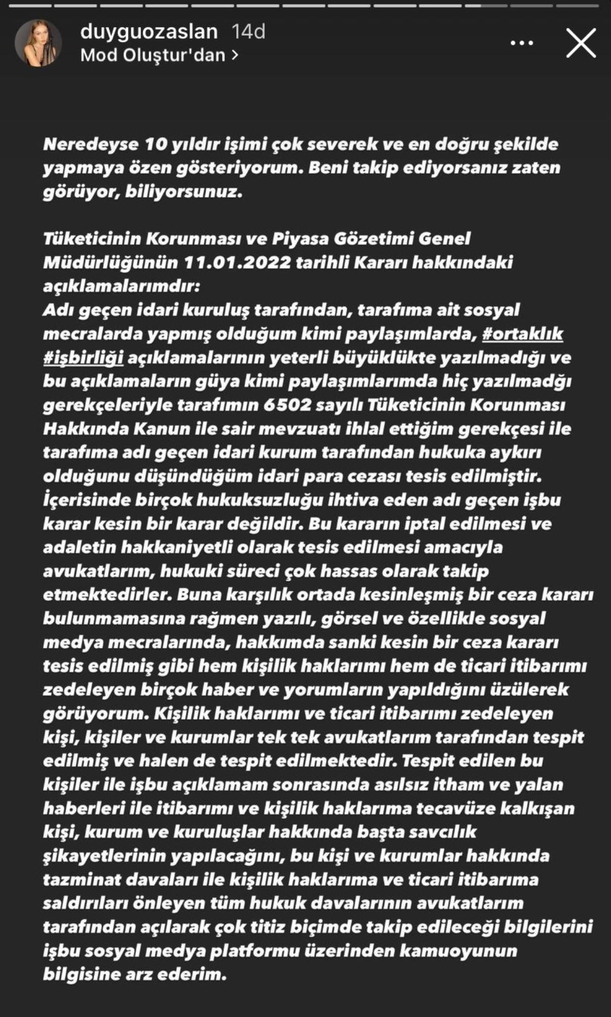 Instagram hesabından bir açıklama yayınlanan Özaslan, şu ifadeleri kullandı: