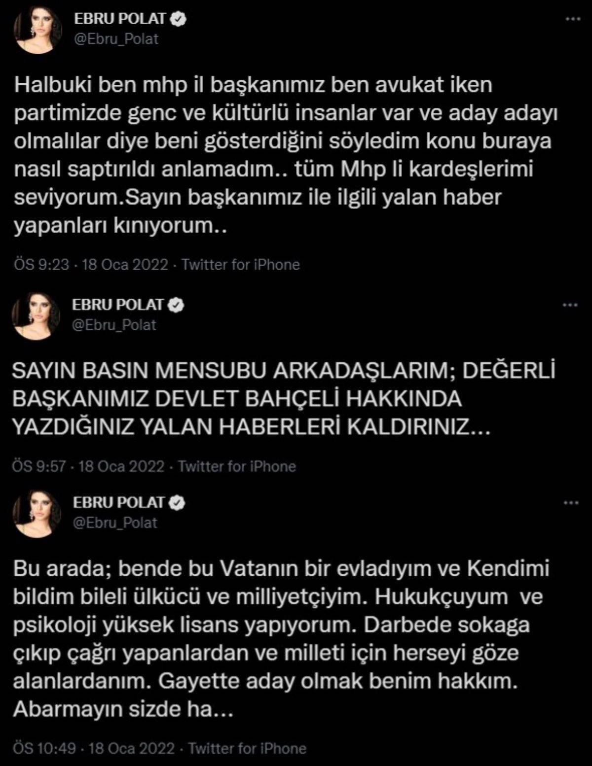 "Halbuki ben MHP İl Başkanımızın, ben avukat iken 'partimizde genç ve kültürlü insanlar var ve aday adayı olmalılar' diye beni gösterdiğini söyledim. Konu buraya nasıl saptırıldı anlamadım... Tüm MHP'li kardeşlerimi seviyorum. Sayın başkanımız ile ilgili yalan haber yapanları kınıyorum..."