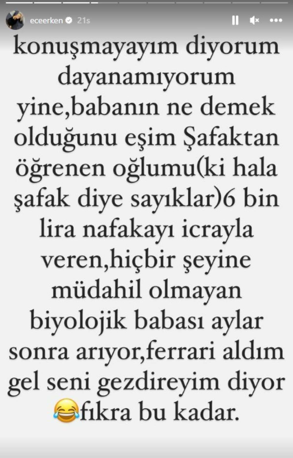 Eymen adındaki oğlunun nafakasını ödemediği için eski eşiyle davalık olan Ece Erken, Instagram hesabından şu sözlerle isyan etti: