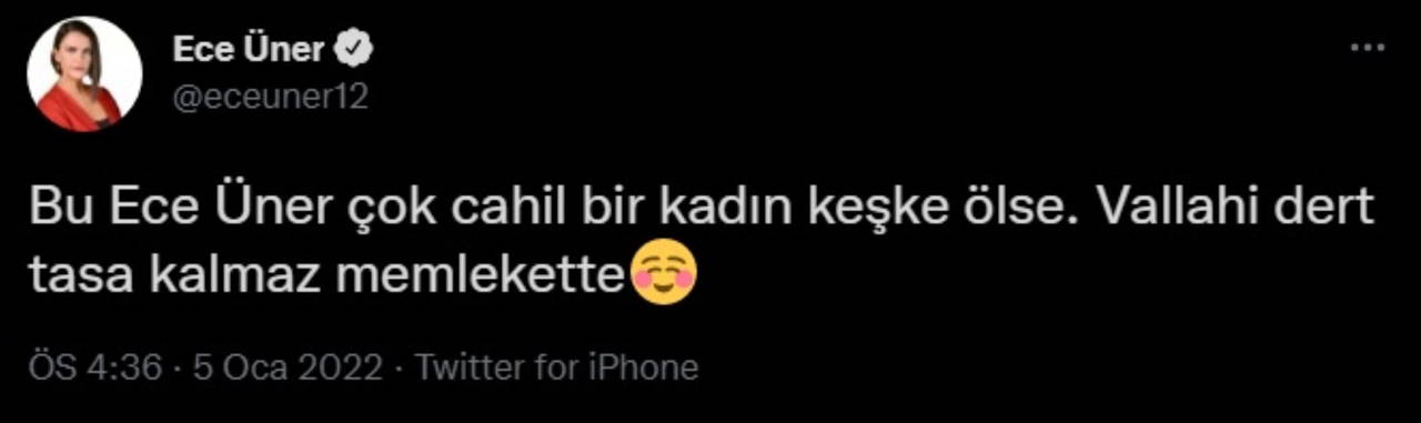 Uzun süre bu konuda yapılan yorumları takip eden Üner en sonunda "Bu Ece Üner çok cahil bir kadın keşke ölse. Vallahi dert tasa kalmaz memlekette" paylaşımı yaparak, yorumlara göndermeli bir cevap vermişti.