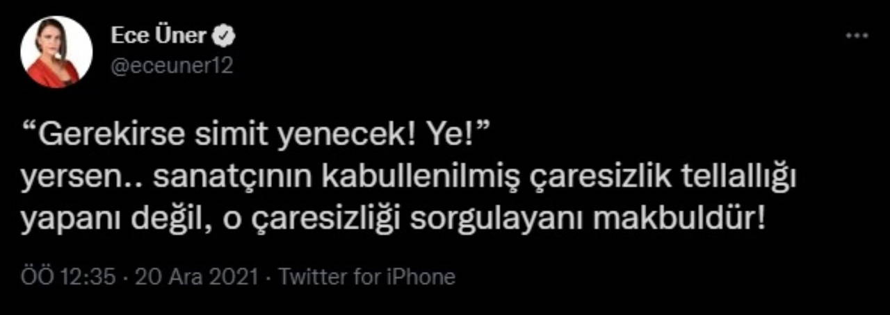 "'Gerekirse simit yenecek!' Ye! Yersen... Sanatçının kabullenilmiş çaresizlik tellallığı yapanı değil, o çaresizliği sorgulayanı makbuldür!"