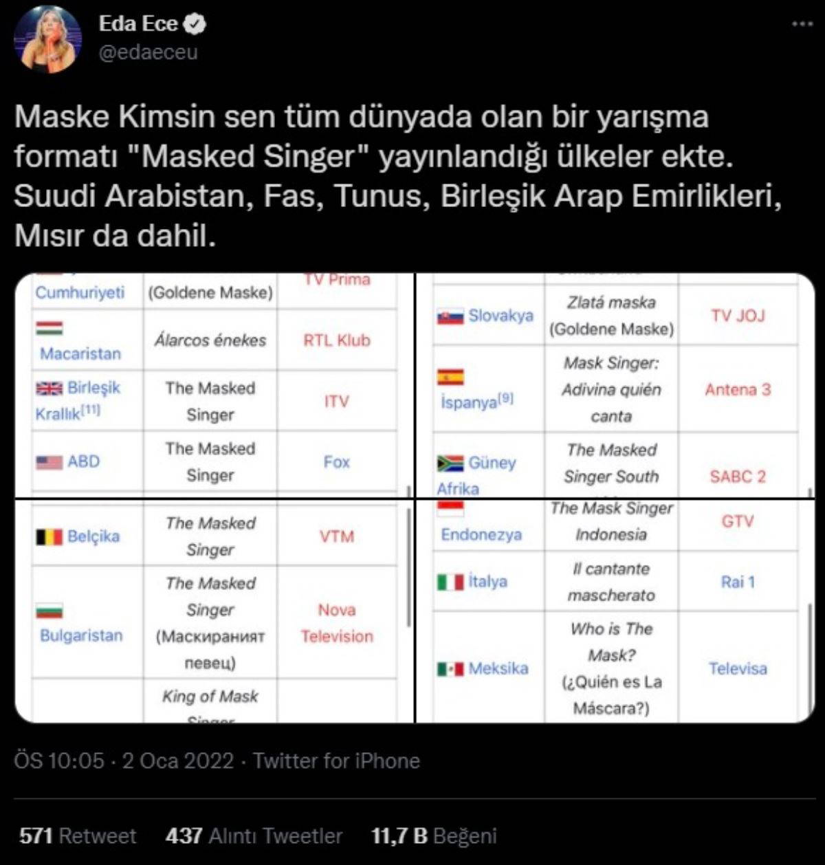 Twitter hesabından bir paylaşım yapan Ece, "Maske Kimsin Sen, tüm dünyada olan bir yarışma formatı. 'Masked Singer'ın yayınlandığı ülkeler ekte. Suudi Arabistan, Fas, Tunus, Birleşik Arap Emirlikleri, Mısır da dahil" ifadelerini kullandı.