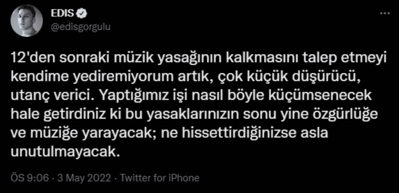 Covid-19 önlemlerinin çoğunun kaldırıldığı fakat gece 12.00'dan sonra müzik yasağının devam ettiği bugünler hakkında konuşan şarkıcı, "12'den sonraki müzik yasağının kalkmasını talep etmeyi kendime yediremiyorum artık, çok küçük düşürücü, utanç verici. Yaptığımız işi nasıl böyle küçümsenecek hale getirdiniz ki bu yasaklarınızın sonu yine özgürlüğe ve müziğe yarayacak; ne hissettirdiğinizse asla unutulmayacak" dedi.
