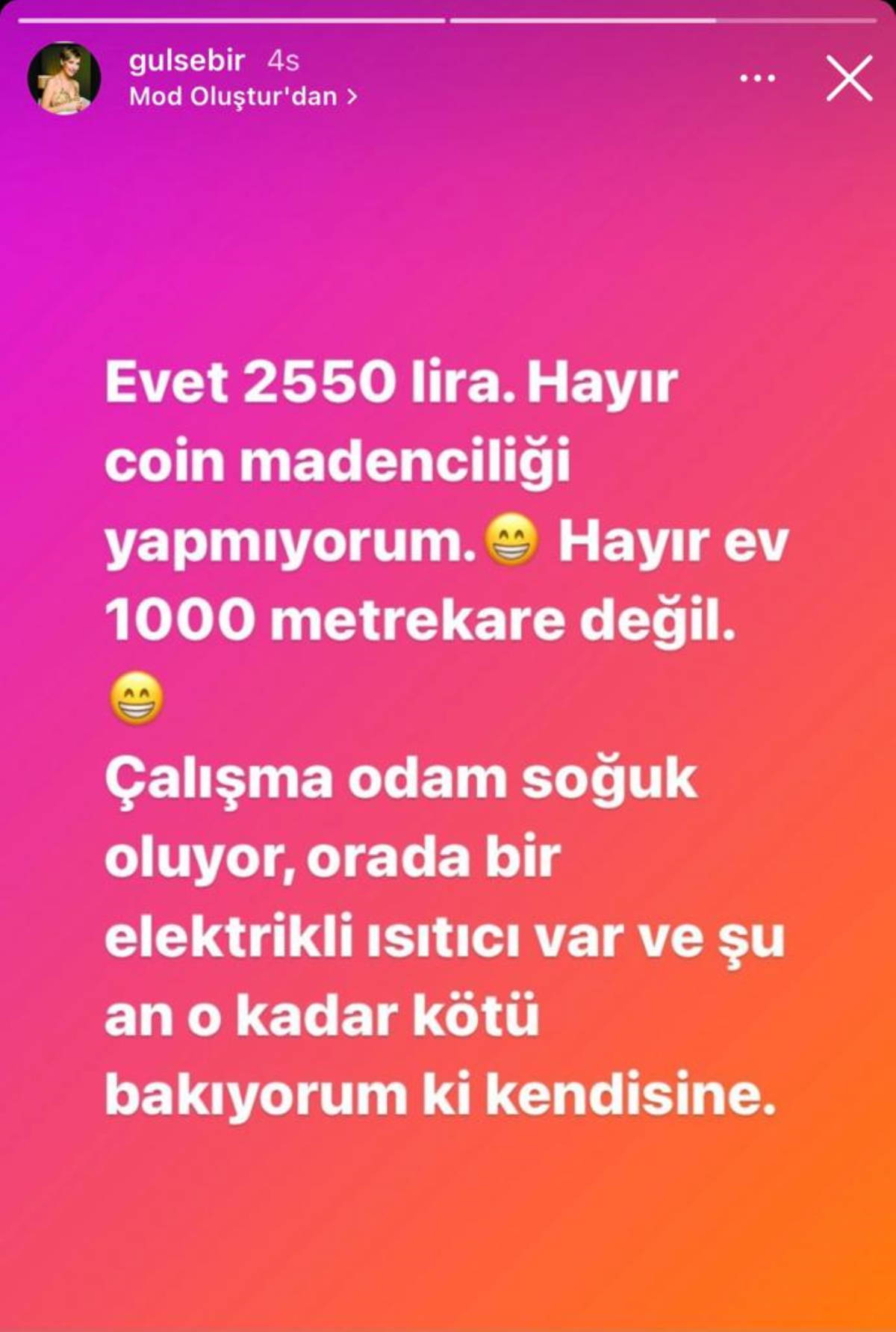 Gülse Birsel gelen yorumlardan sonra bir paylaşım daha yaparak "Coin madenciliği yapmıyorum. Ev 1000 metrekare değil. Çalışma odam soğuk oluyor orada bir elektrikli ısıtıcı var şu an o kadar kötü bakıyorum ki kendisine..." dedi.
