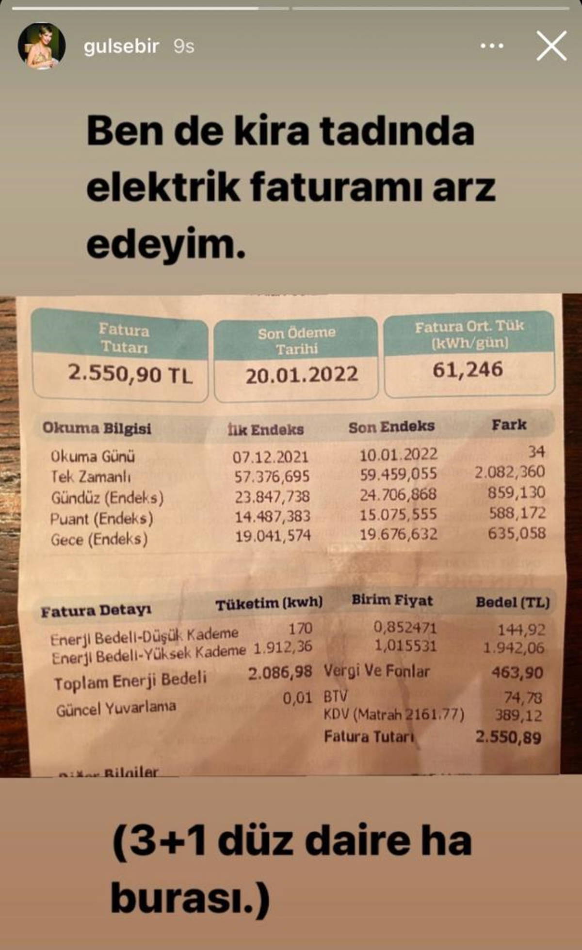 Evine 2550 TL elektrik faturası gelen oyuncu Gülse Birsel Instagram hesabından faturayı paylaşarak, “Ben de kira tadında elektrik faturamı arz edeyim. 3+1 düz daire ha burası” sözleriyle isyan etti.