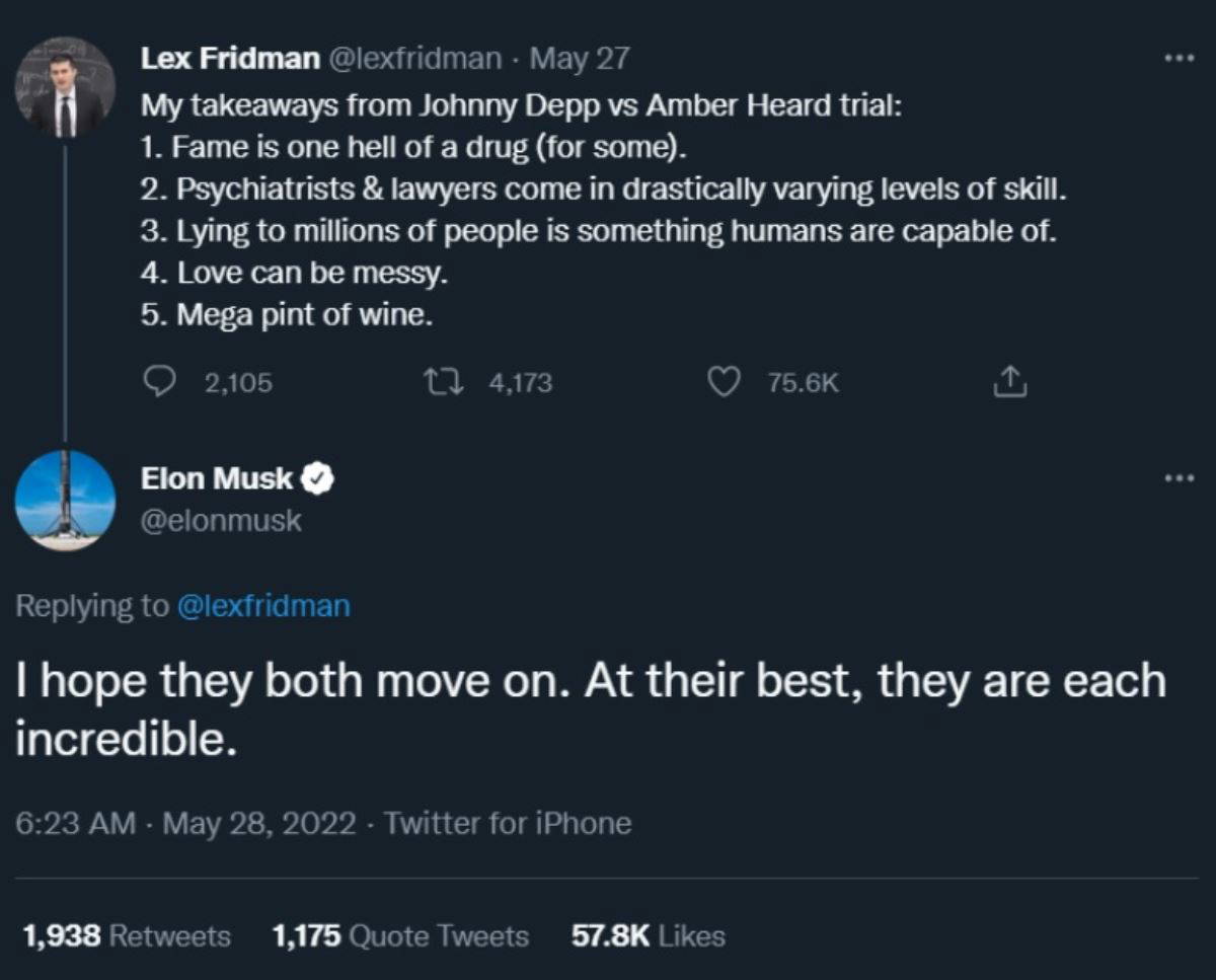 MIT'de araştırma bölümünde çalışan Fridman, Twitter'dan yaptığı paylaşımda davayla ilgili 5 madde sıraladı. Sunucu, davada yer alan avukatların becerilerine atıfta bulunurken insanların rahatlıkla yalan söyleyebildiğine ve aşkın karmaşık olabileceğine dair yorumlarda bulundu.
