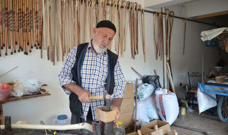 Yaşına rağmen marangozluk gibi zor bir işi keyifle sürdüren Bahri Bağlı, ormanda topladığı ağaç dallarından başta baston olmak üzere çok farklı ev eşyası yaptığını belirterek,