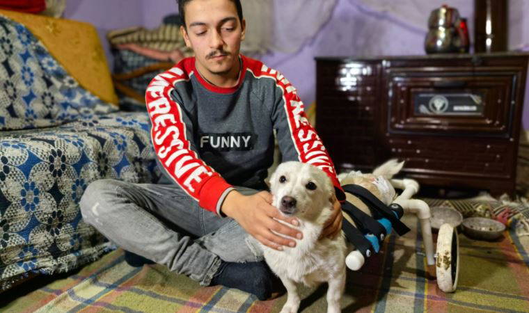 Arka ayakları tutmadığı için yürüyemeyen ve bedenini sürüklemek zorunda kalan köpeği alıp evine getiren Başkurt, 9 aylık köpeğe beyaz tüyleri nedeniyle ‘Pamuk’ ismini verdi.