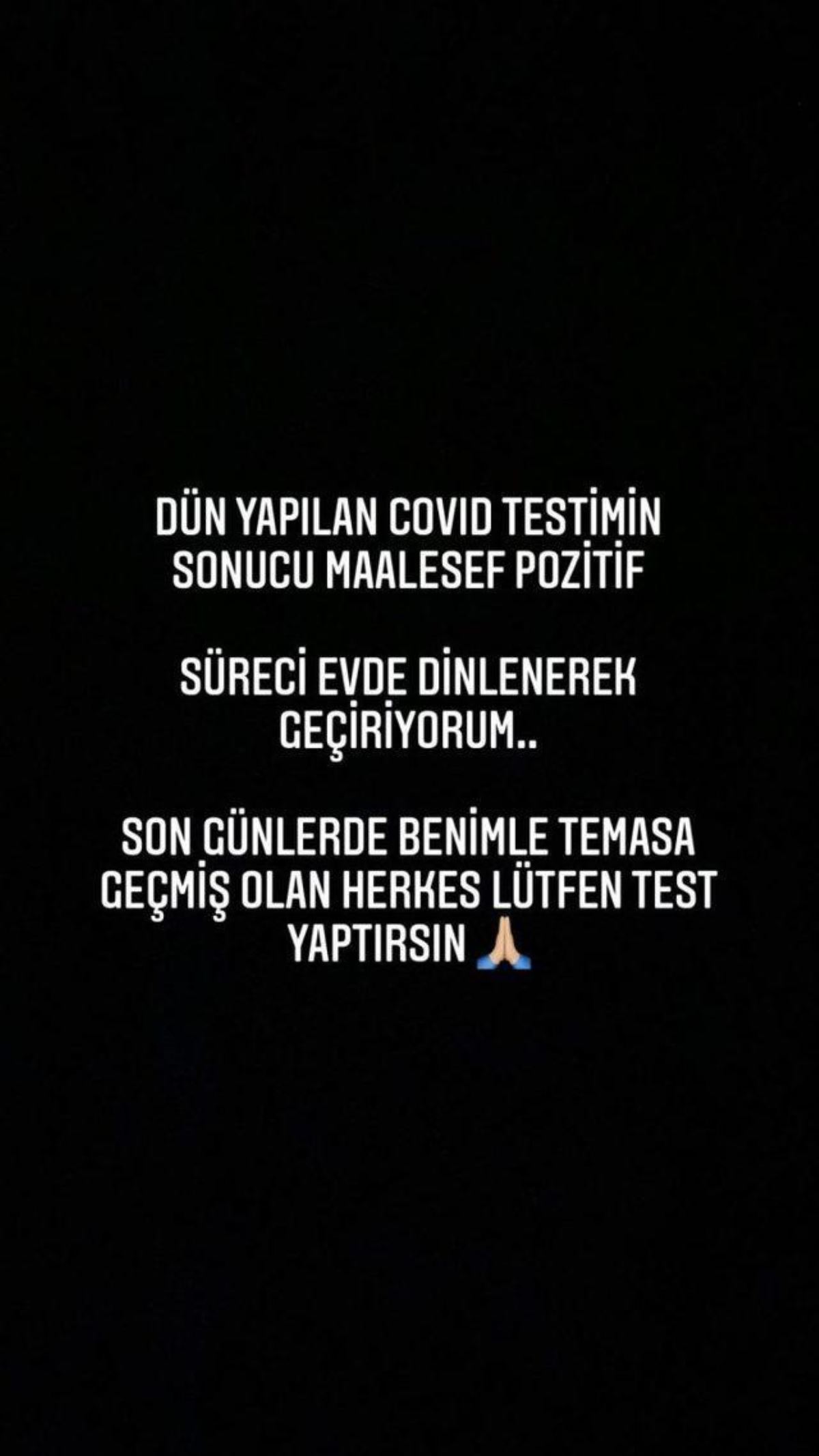"Dün yapılan Covid testimin sonucu maalesef pozitif. Süreci evde dinlenerek geçiriyorum. Son günlerde benimle temasa geçmiş olan herkes lütfen test yaptırsın."