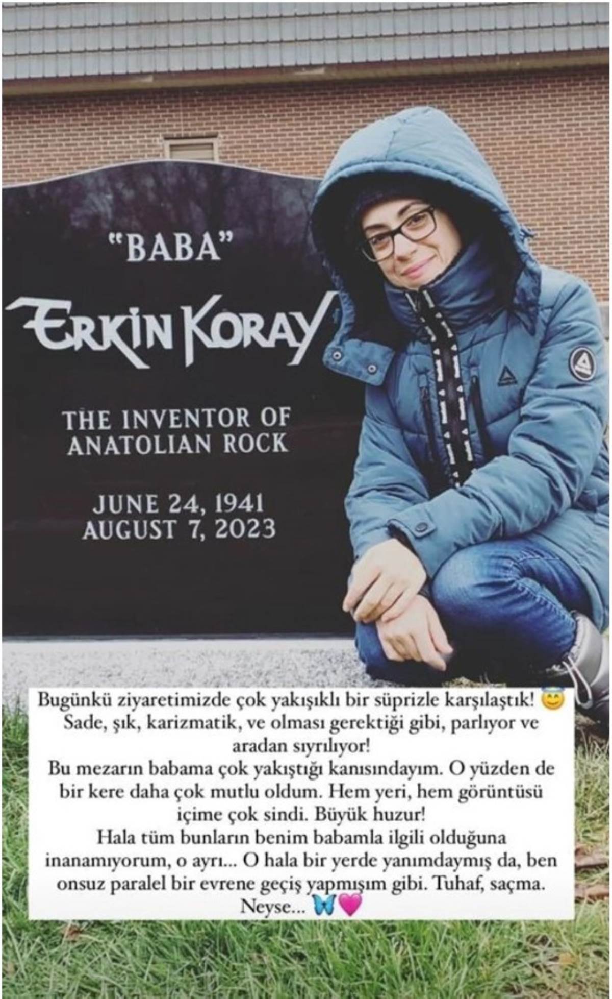Damla Koray paylaşımına "Bugünkü ziyaretimizde çok yakışıklı bir sürprizle karşılaştık… Sade, şık, karizmatik ve olması gerektiği gibi parlıyor ve aradan sıyrılıyor. Bu mezarın babama çok yakıştığı kanısındayım. O yüzden de bir kere daha mutlu oldum. Hem yeri, hem görüntüsü içime çok sindi… Büyük huzur! Hâlâ tüm bunların benim babamla ilgili olduğuna inanamıyorum o ayrı… O hâlâ bir yerde yanımdaymış da, ben onsuz paralel bir evrene geçiş yapmışım gibi… Tuhaf, saçma, neyse…" notunu düştü.