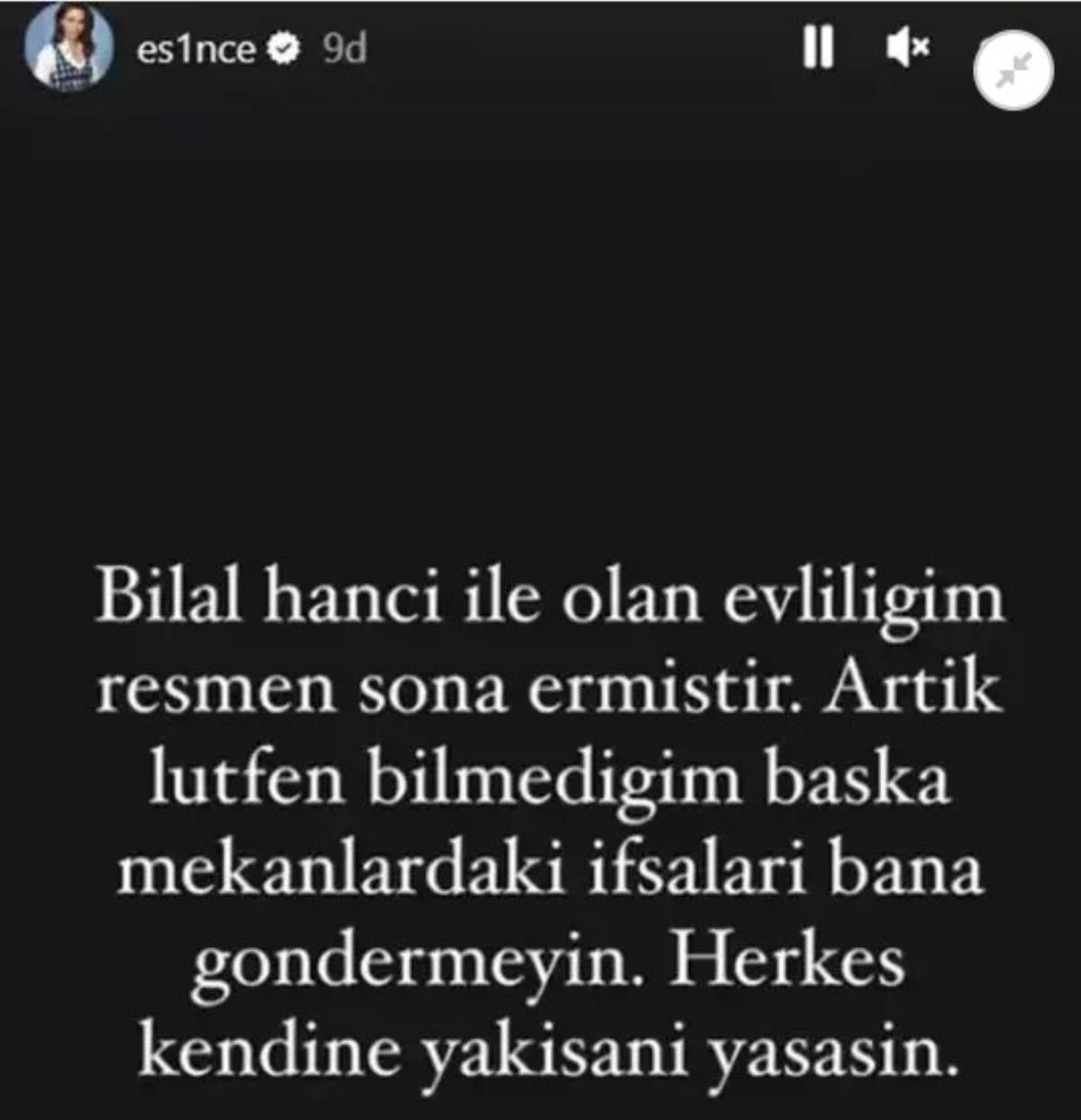 "Bilal Hancı ile olan evliliğim resmen sona ermiştir. Artık lütfen bilmediğim başka mekanlardaki ifşalarını bana göndermeyin."