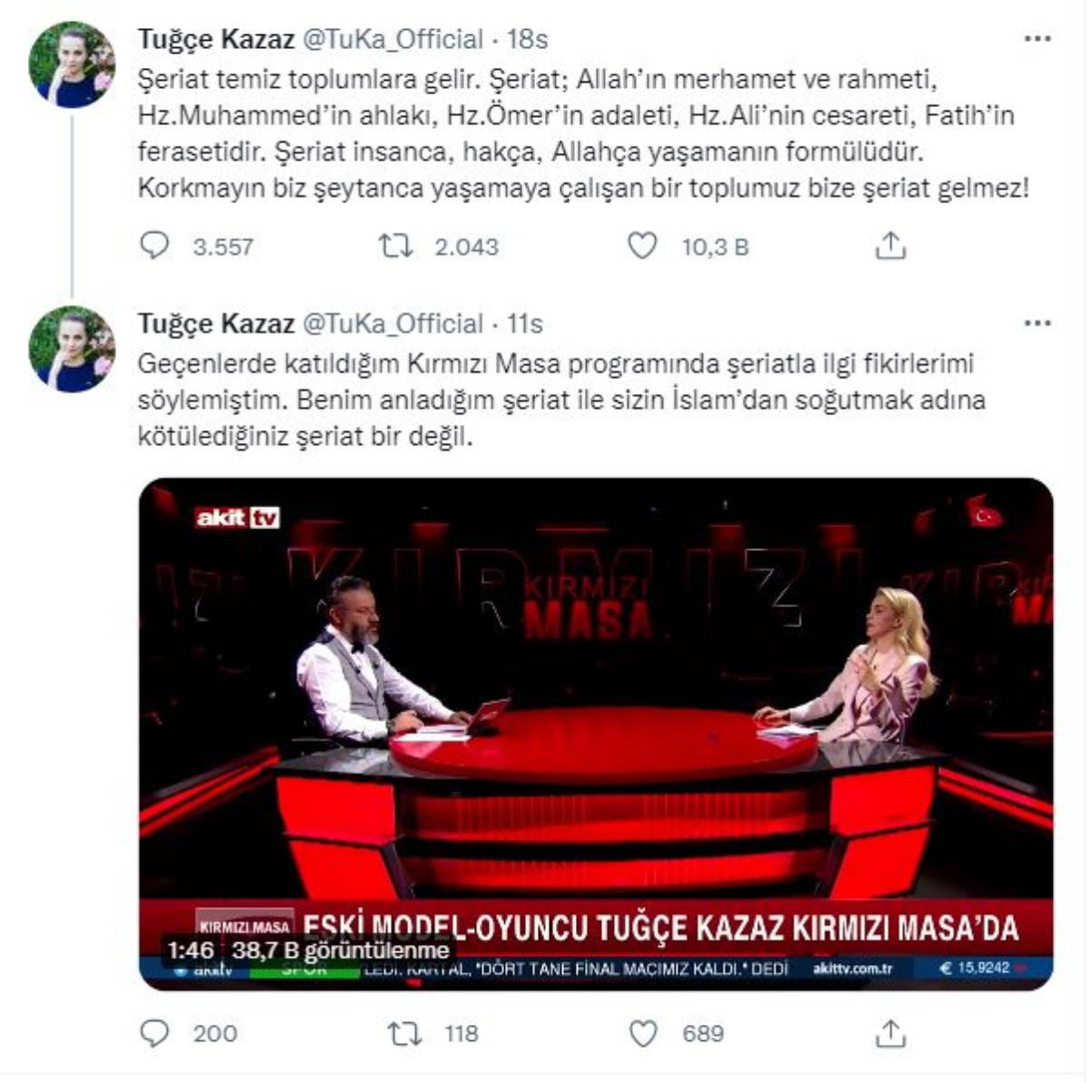 Bir dönem adından çokça söz ettiren eski manken Tuğçe Kazaz bu kez de şeriat için kullandığı övgü dolu sözlerle tepki çekti.