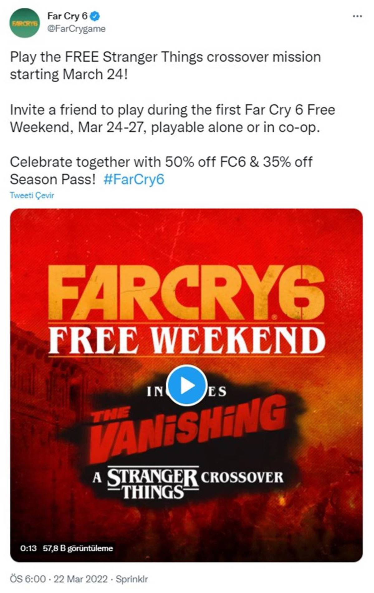 Ubisoft'un yapımcısı olduğu Far Cry 6 oyunu, 24-27 Mart 2022 tarihleri arasında Xbox Series X/S, Xbox One, PS5, PS4 ile bilgisayarda Epic Games Store ve Ubisoft Store üzerinden ücretsiz oynanabilecek. Far Cry 6 ücretsiz oynamak için bu platformlardan birine kayıt olmalı ve oyunun satın alma sayfasına gitmelisiniz.