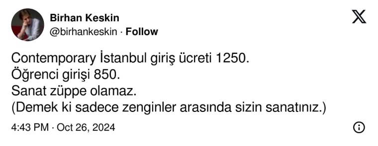Uçuk fiyatlara tepki gösteren isimlerden biri de Birhan Keskin oldu. Ünlü şair ve yazar Keskin, "Contemporary İstanbul giriş ücreti 1250. Öğrenci girişi 850. Sanat züppe olamaz" diyerek çıkıştı.