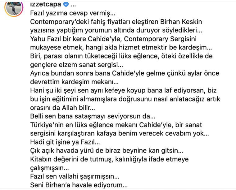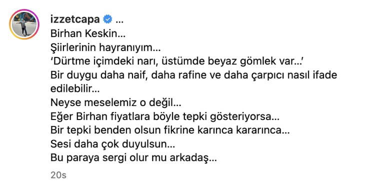 Birhan Keskin'in paylaşımını alıntılayıp kendisine destek veren ünlü işletmeci İzzet Çapa da "Bu paraya sergi olur mu arkadaş…" diyerek çıkıştı ve şu ifadeleri kullandı: