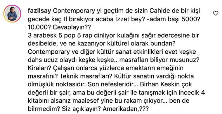 Çapa'nın bu paylaşımına sessiz kalamayan isimse ünlü piyanist Fazıl Say oldu. Say, "Contemporary'yi geçtim de sizin Cahide'de bir kişi gecede kaç tl bırakıyor acaba İzzet bey? -adam başı 5000? 10.000? Cevaplayın??" diyerek öfkelendi.