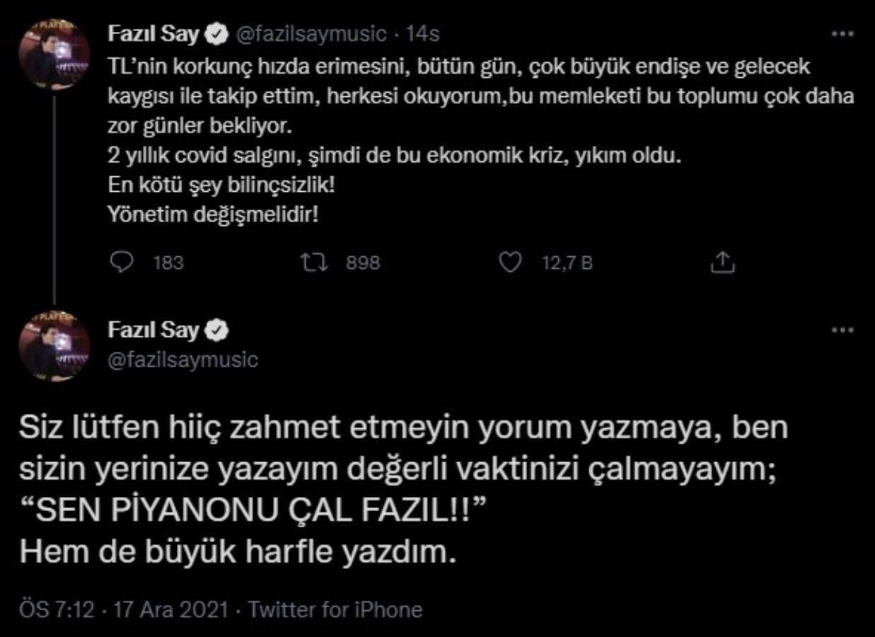 Son olarak ünlü piyanist Fazıl Say, sosyal medya hesabından yaptığı paylaşımla ekonominin ve ülkenin gidişatını eleştirdi. "Bu toplumu çok daha zor günler bekliyor" diyen Say, "Yönetim değişmelidir!" ifadelerini kullandı.
