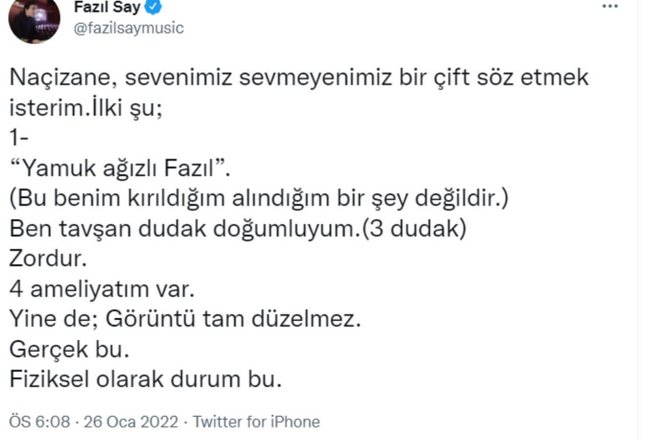 Bu paylaşımının ardından hem AKP'liler hem de MHP'liler tarafından hedef alınan Say, kendisine dış görünüşü üzerinden yapılan saldırgan yorumlara 5 maddede yanıt verdi.