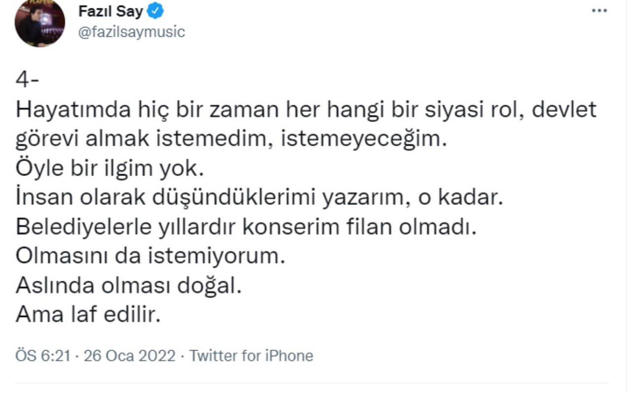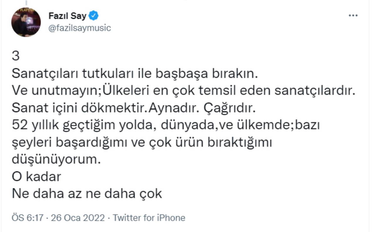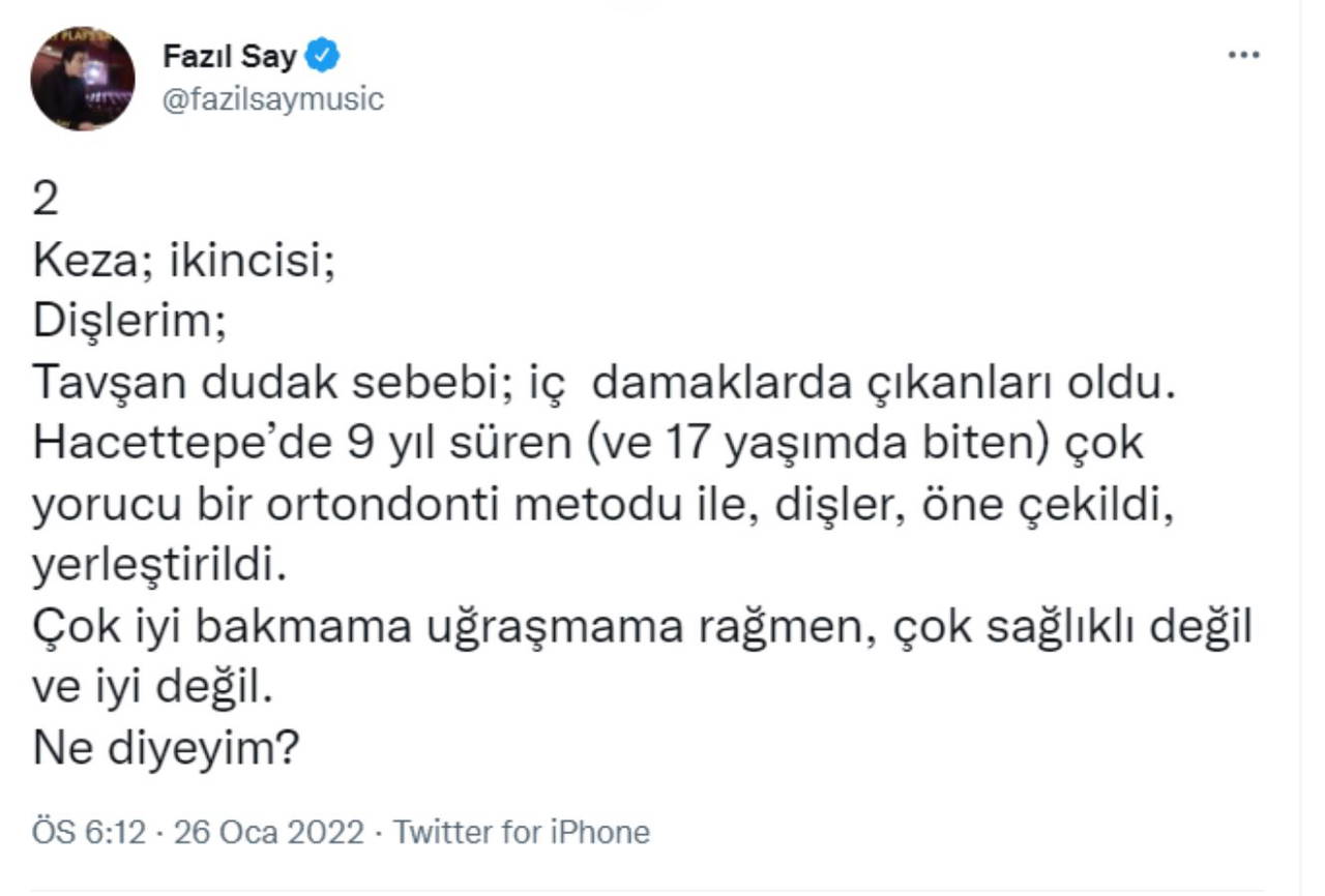 Paylaşımlarına ''Naçizane, sevenimiz sevmeyenimiz bir çift söz etmek isterim'' diye başlayan Say, şu ifadeleri kullandı:
