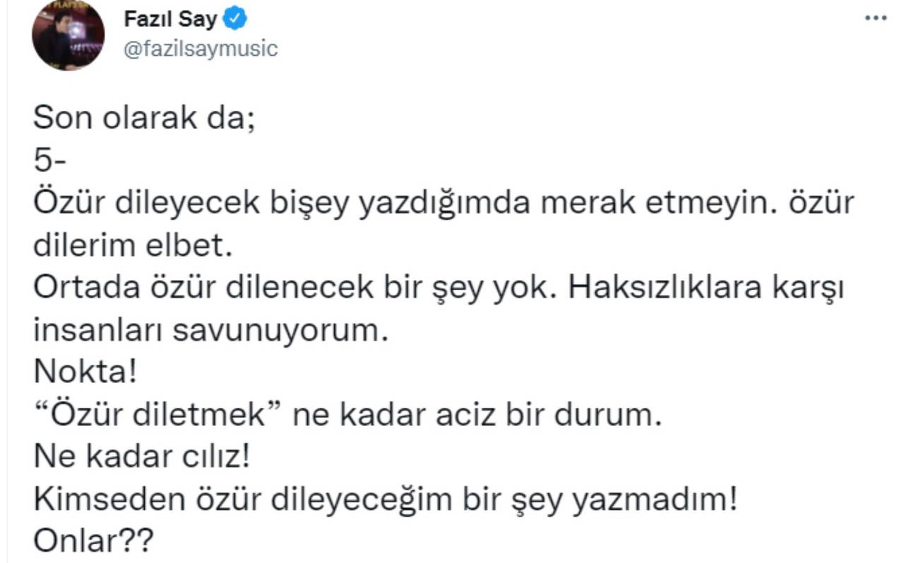 Son olarak da; 5- Özür dileyecek bir şey yazdığımda merak etmeyin. Özür dilerim elbet. Ortada özür dilenecek bir şey yok. Haksızlıklara karşı insanları savunuyorum. Nokta! ‘Özür diletmek’ ne kadar aciz bir durum. Ne kadar cılız! Kimseden özür dileyeceğim bir şey yazmadım! Onlar??”
