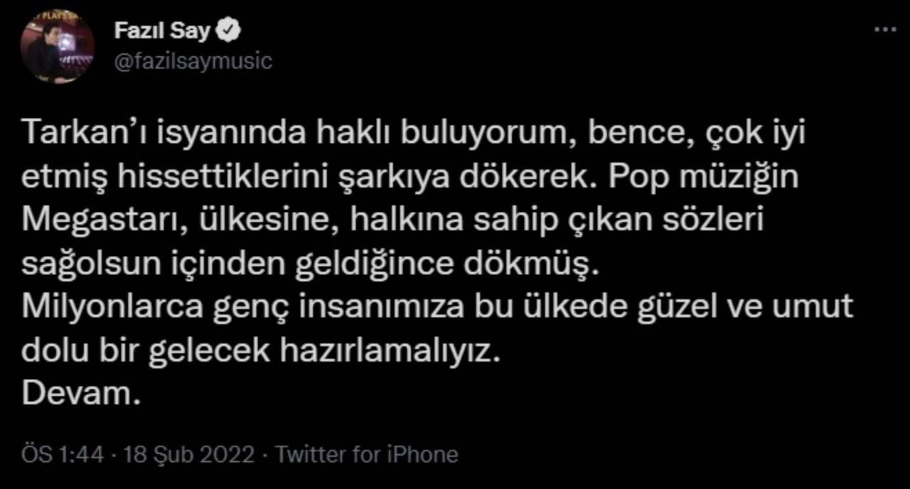 piyanist Fazıl Say’dan konuya ilişkin bir paylaşım geldi. Say, “Tarkan’ı