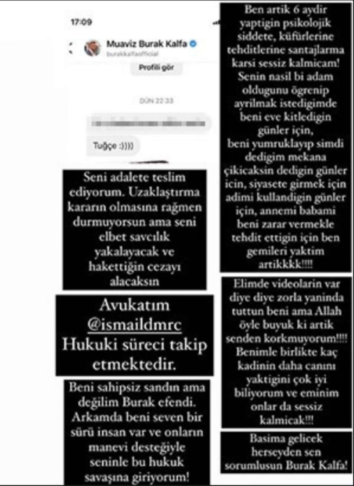 "Seni adalete teslim ediyorum. Uzaklaştırma kararın olmasına rağmen durmuyorsun ama seni elbet savcılık yakalayacak ve hak ettiğin cezayı alacaksın. Beni sahipsiz sandın ama değilim Burak Efendi... Arkamda beni seven bir sürü insan var ve onların manevi desteğiyle bu hukuk savaşına giriyorum. Ben artık 6 aydır yaptığın psikolojik şiddete, küfürlerine, tehditlerine, şantajlarına karşı sessiz kalmayacağım. Senin nasıl biri olduğunu öğrenip ayrılmak istediğimde beni eve kilitlediğin günler için, beni yumruklayıp ‘İstediğim mekânda sahneye çıkacaksın’ dediğin günler için, siyasete girmek için adımı kullandığın günler için, annemi babamı beni zarar vermekle tehdit ettiğin için ben gemileri yaktım artık! Elimde videoların var diye beni zorla yanında tuttun ama Allah artık öyle büyük ki kimseden korkmuyorum! Benimle birlikte birkaç kadının daha canını yaktığını biliyorum ve eminim onlar da sessiz kalmayacak! Başına gelecek her şeyden sen sorumlusun Burak Kalfa!"