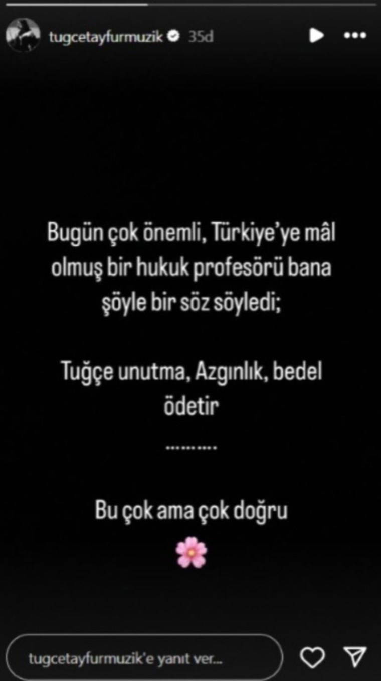Tuğçe Tayfur daha sonra ise olay yaratacak bir başka paylaşım yaptı. Tayfur'un paylaşımında şu ifadeleri kullandı: